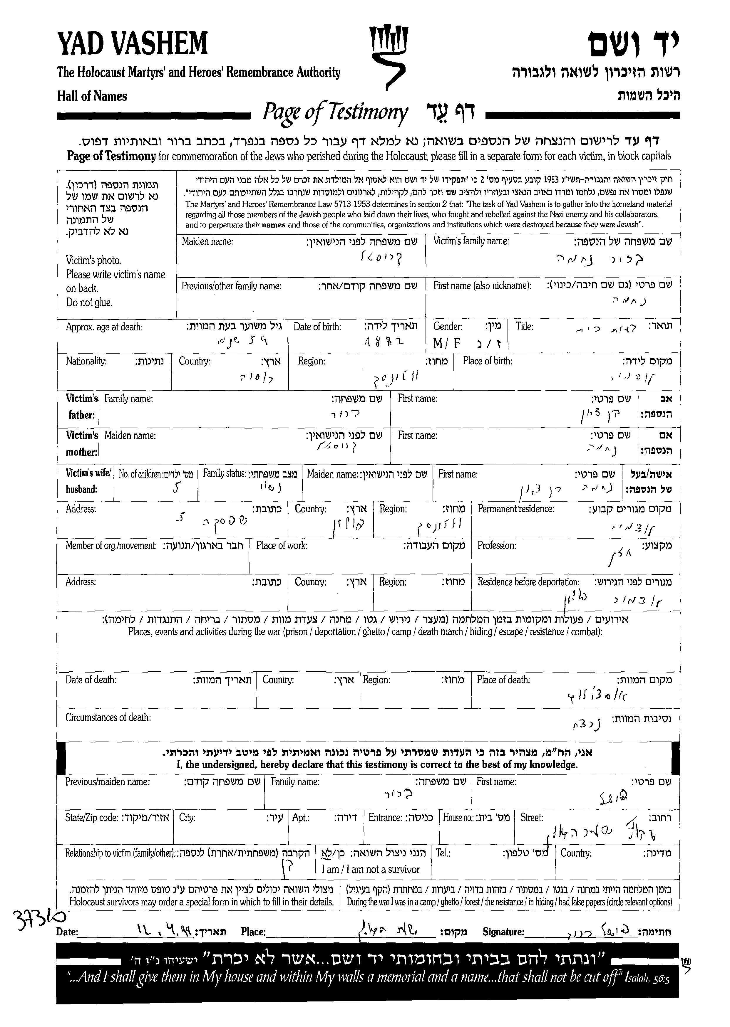 Яд Вашем - Листы свидетельских показаний Мемориального фонда