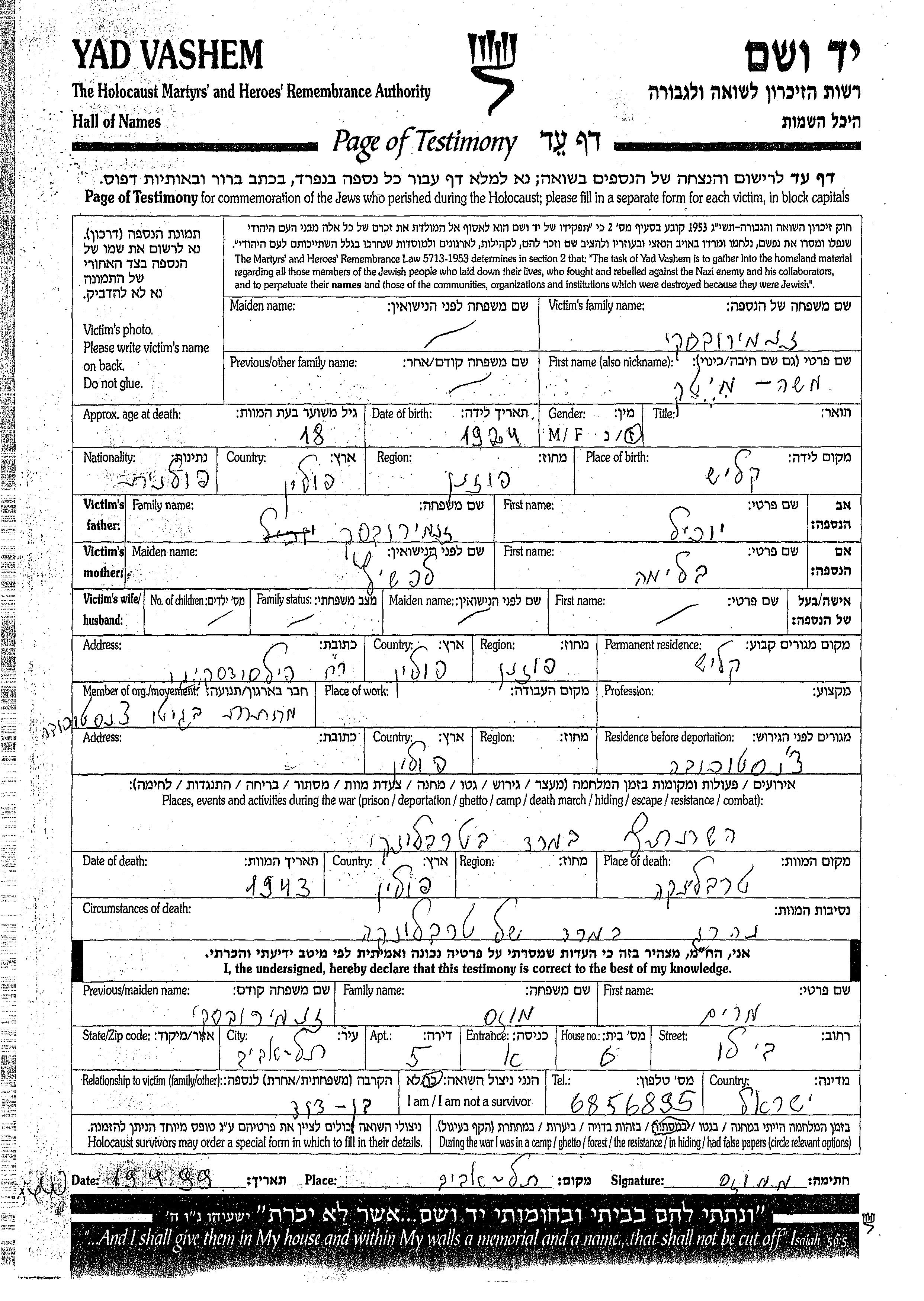 Знамировски Моше Метек 1924 Калиш, Польша Лист свидетельских показаний