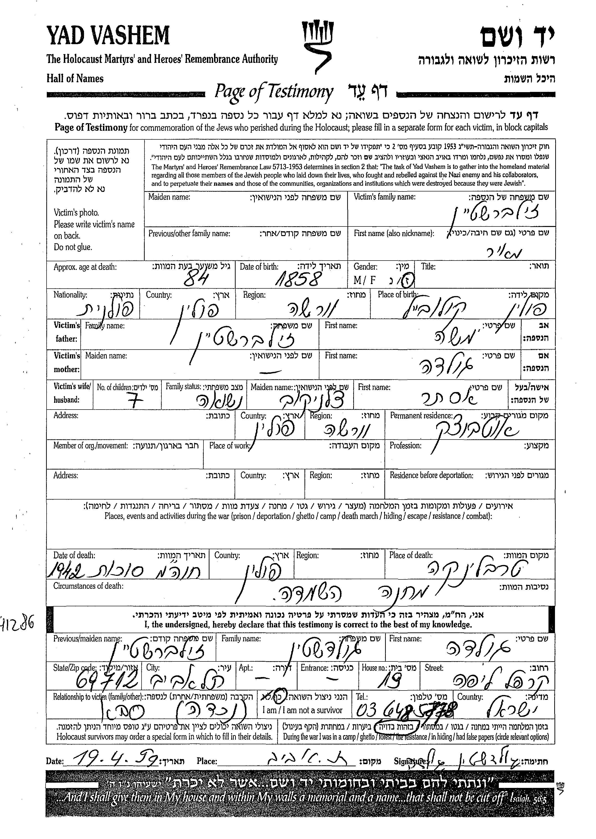 Меир Зильберштейн, место рождения: Колбель, Польша. Отец: Моше, mать:Голда. Женат / замужем. Место жительства до войны: Отвоцк, Польша.