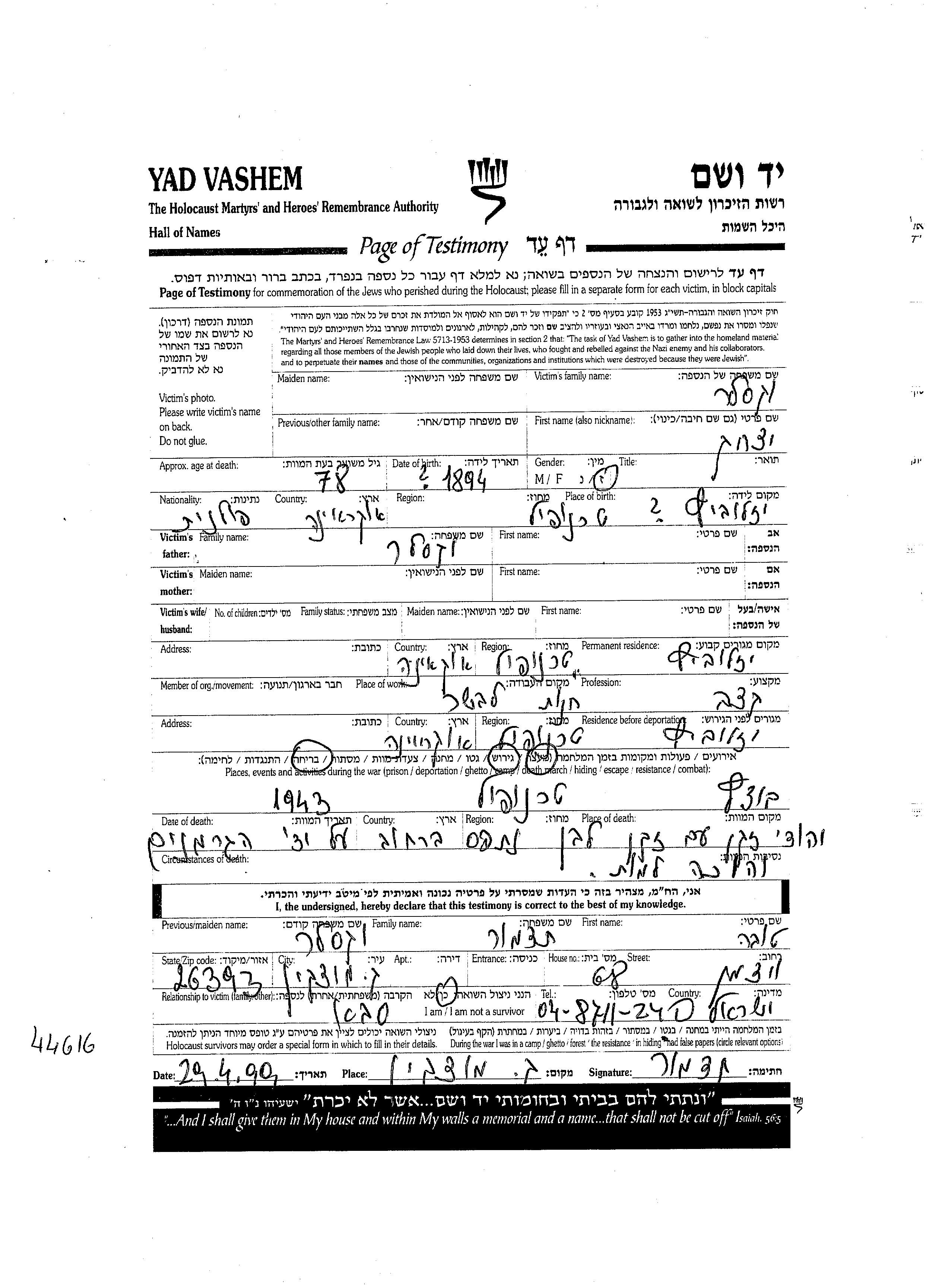 Векслер Ицхак 1894 Язловец, Польша Лист свидетельских показаний
