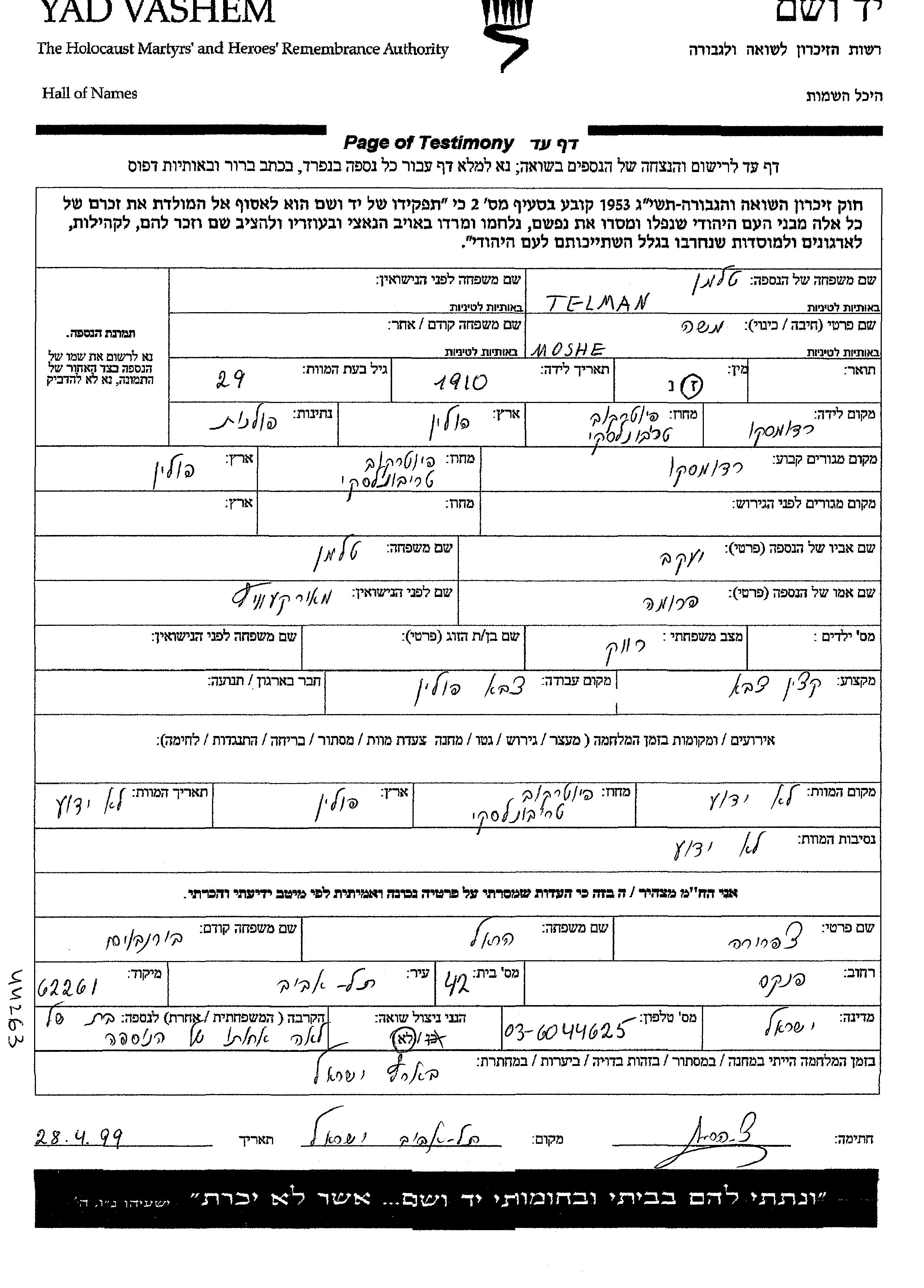 Моше Тельман, место рождения: Радомско, Польша. Отец: Яков, mать:Фрума, девичья фамилия Меиркевич. Офицер польской армии. Холост / не замужем.
