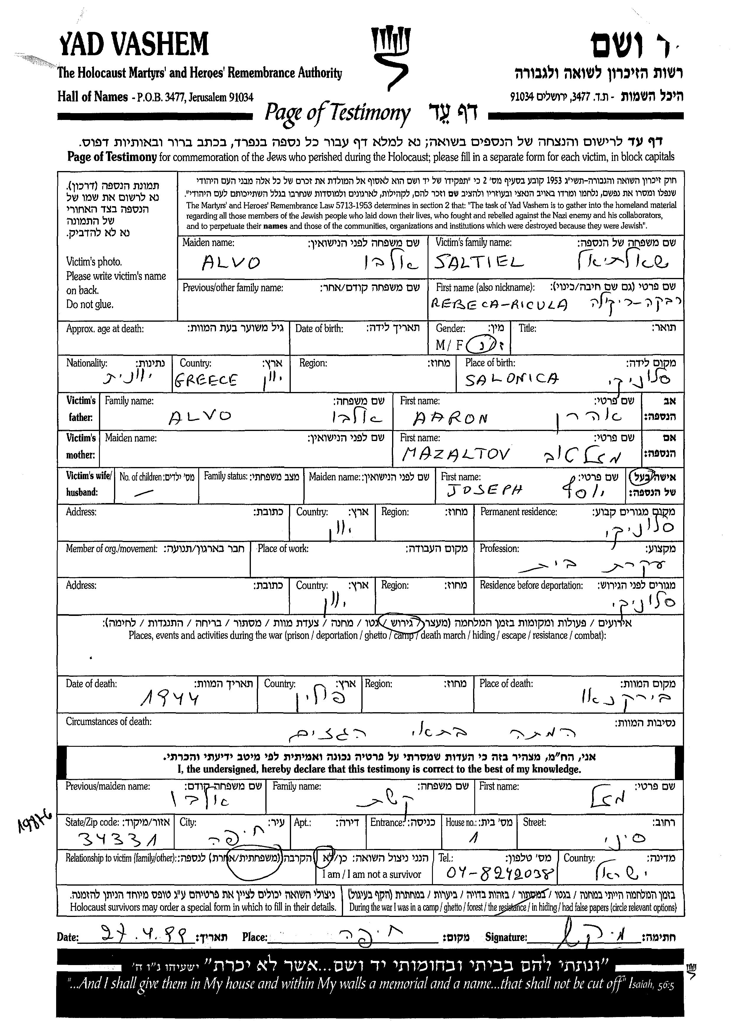 Рикула Сальтиэль, девичья фамилия Альво, место рождения: Салоники, Греция. Отец: Аарон, mать:Мазаль Тов. Домохозяйка. Женат / замужем. Место жительства до войны: Салоники, Греция. Место во время войны: Салоники, Греция.
