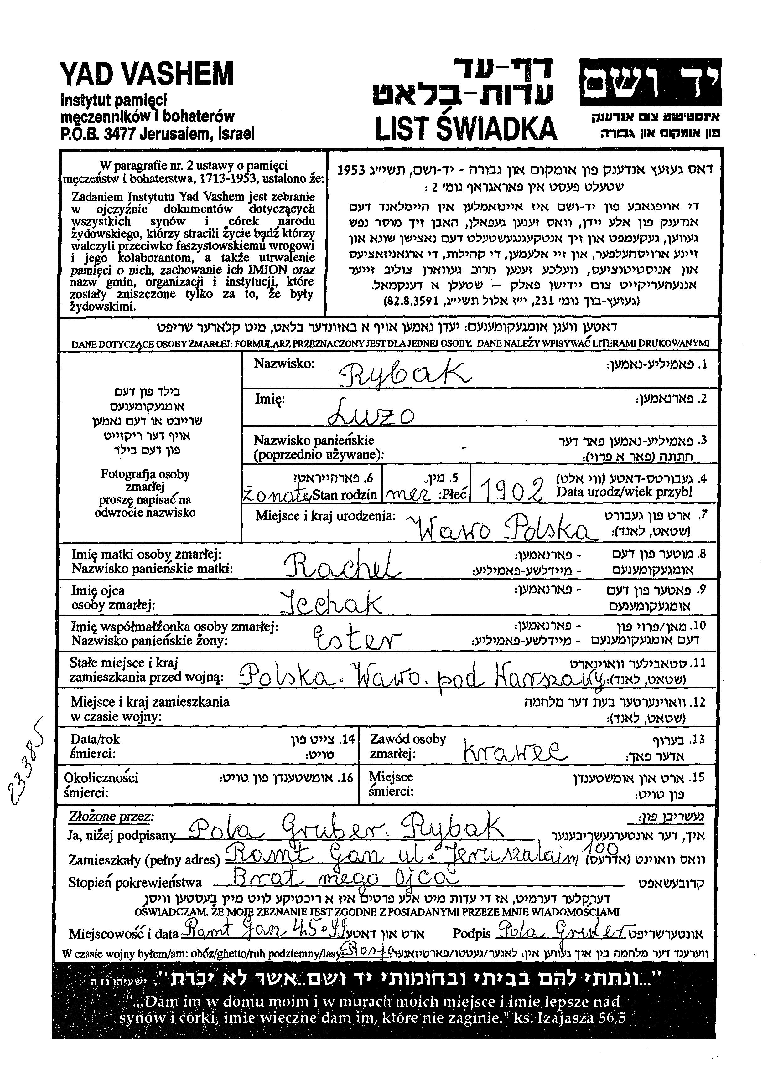 Элиэзер Рыбак, место рождения: Вавер, Польша. Отец: Ицхак, mать:Рахель. Портной / портниха. Женат / замужем. Место жительства до войны: Вавер, Польша.