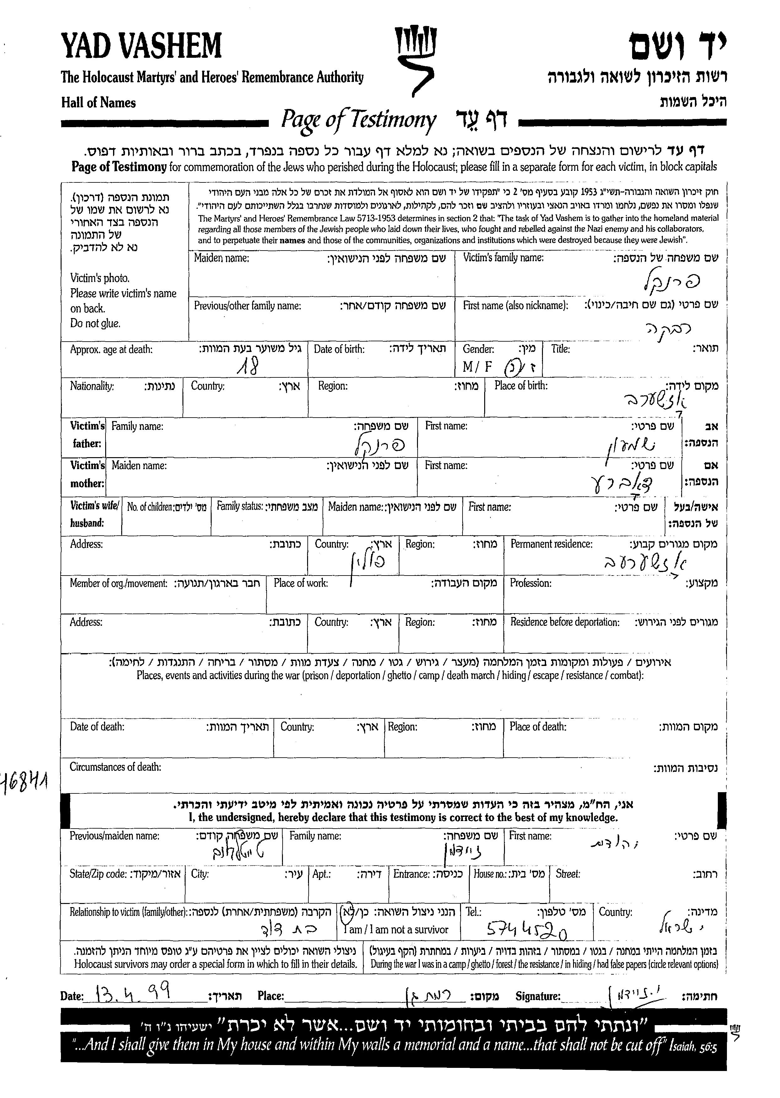 Яд Вашем - Листы свидетельских показаний Мемориального фонда