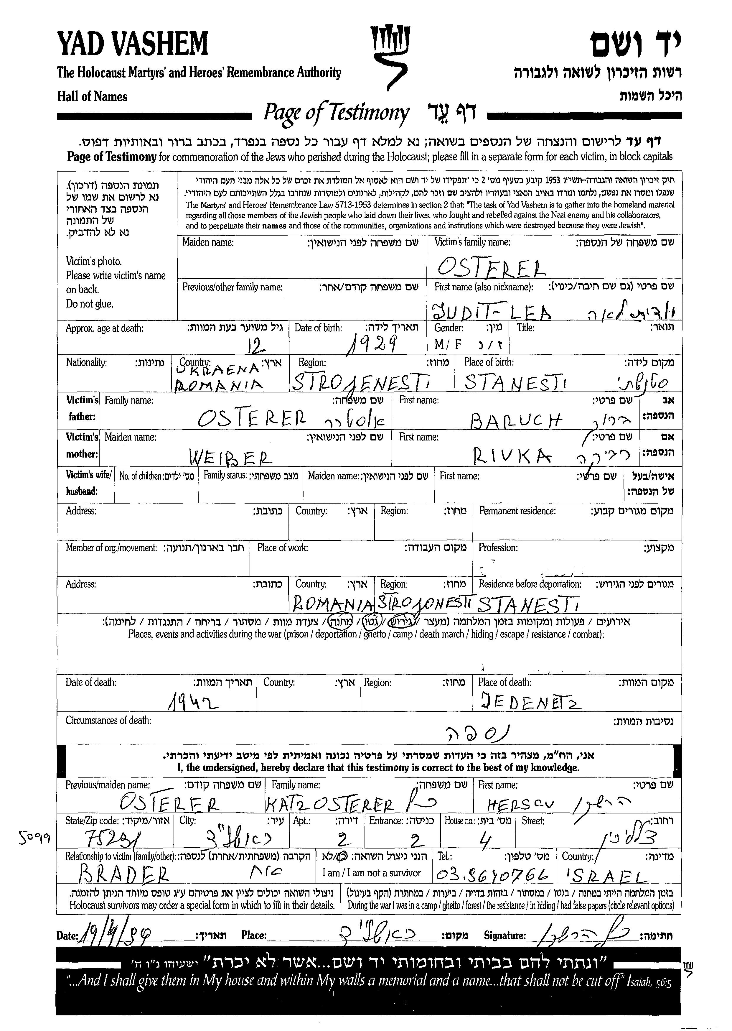 Лея Юдит Остерер, место рождения: Стэнешть, Румыния. Отец: Барух, mать:Ривка, девичья фамилия Вайбер. Подросток. Место во время войны: Стэнешть, Румыния.