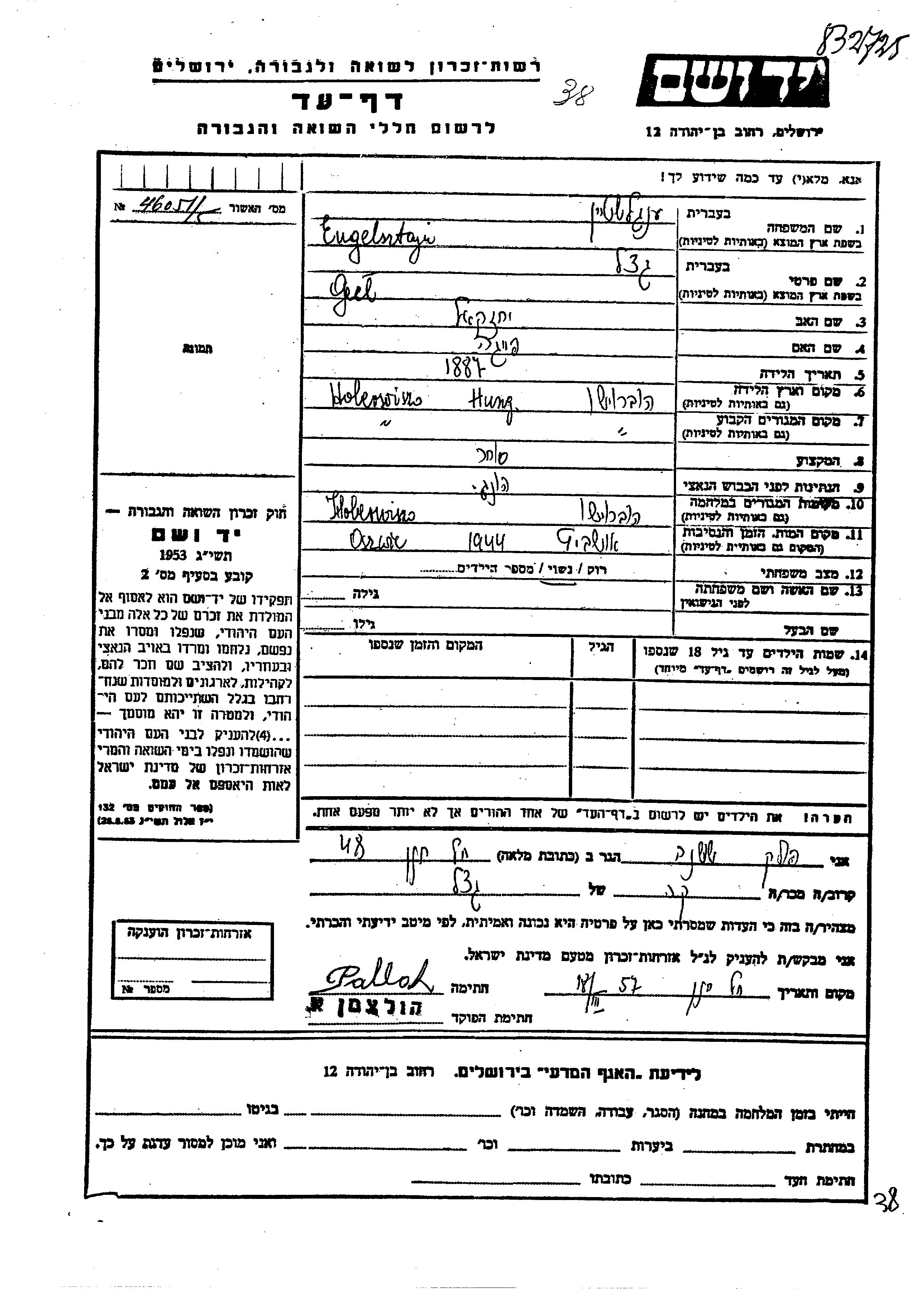 Гецель Энгельштейн, место рождения: Хобервисо, Румыния. Отец: Иехезкель, mать:Фейга. Торговец / торговка. Женат / замужем. Место жительства до войны: Хобервисо, Румыния. Место во время войны: Хобервисо, Румыния.