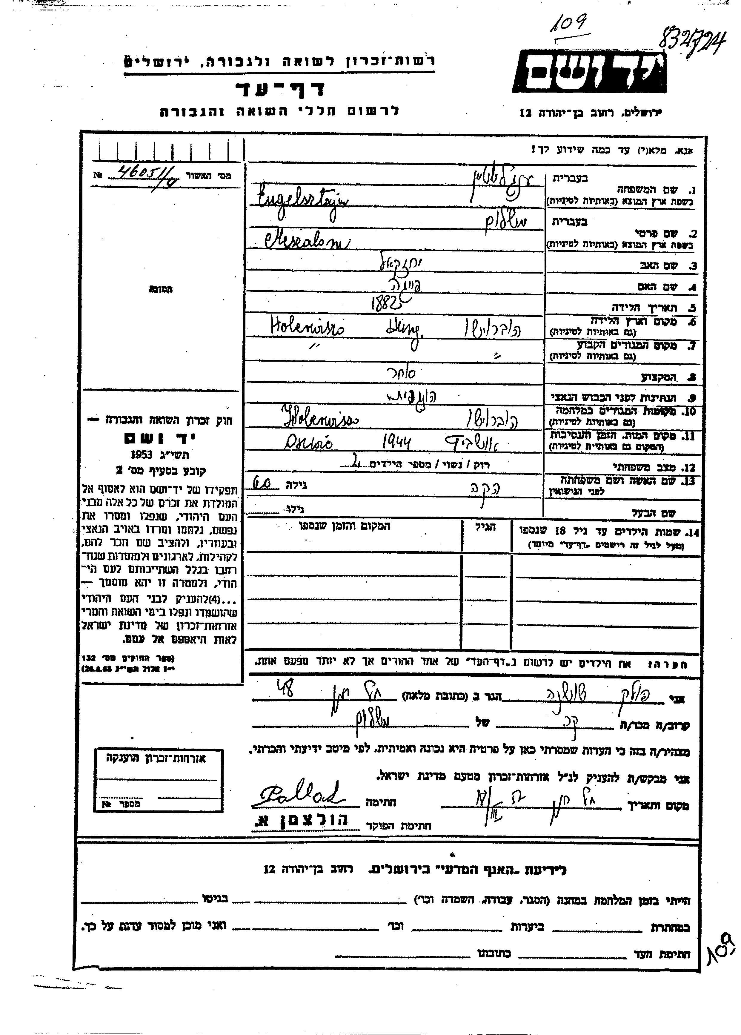 Энгельштайн Мешулам 1882 Хобервисо, Румыния Лист свидетельских показаний