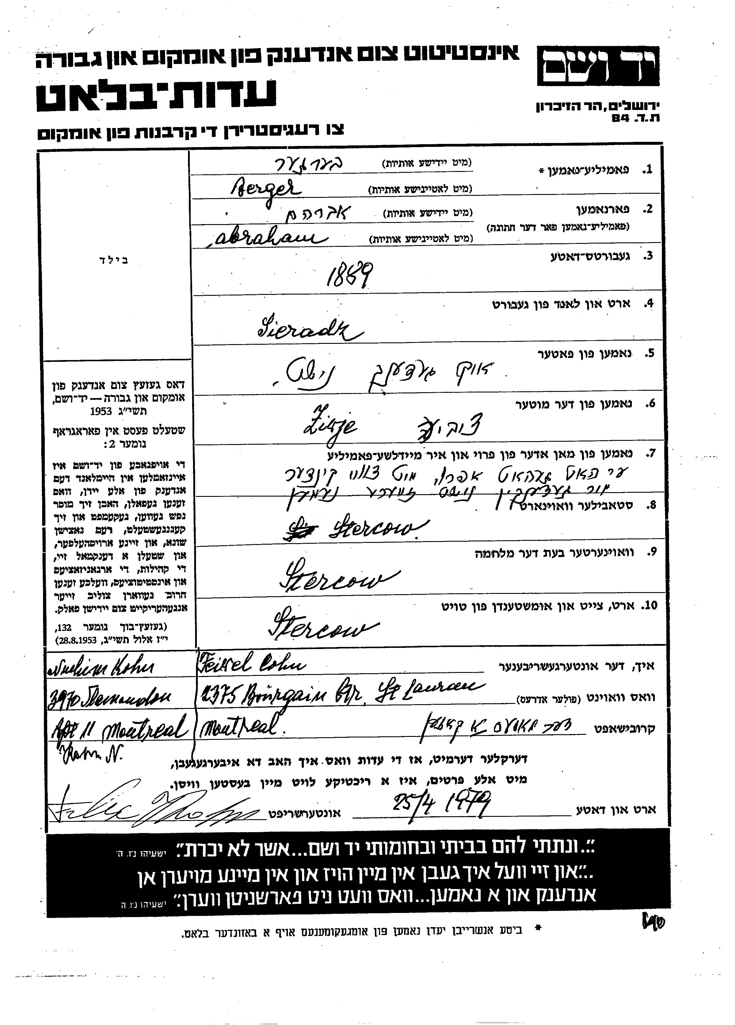Авраам Бергер, место рождения: Серадз, Польша.Mать:Цивье. Место жительства до войны: Стерцов, Польша. Место во время войны: Стерцов, Польша.