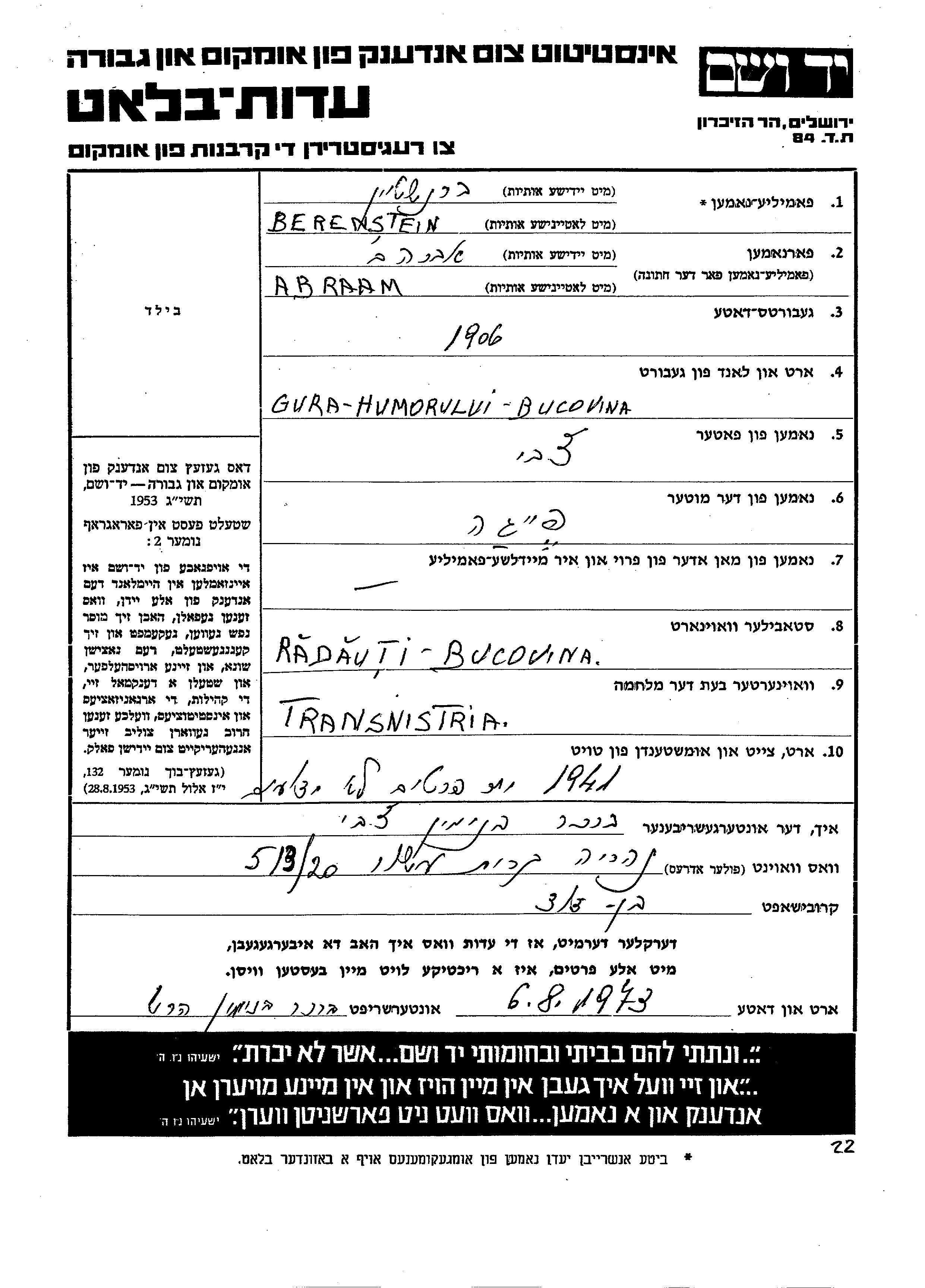 Бернштейн Авраам 1906 Рэдэуци, Румыния Лист свидетельских показаний