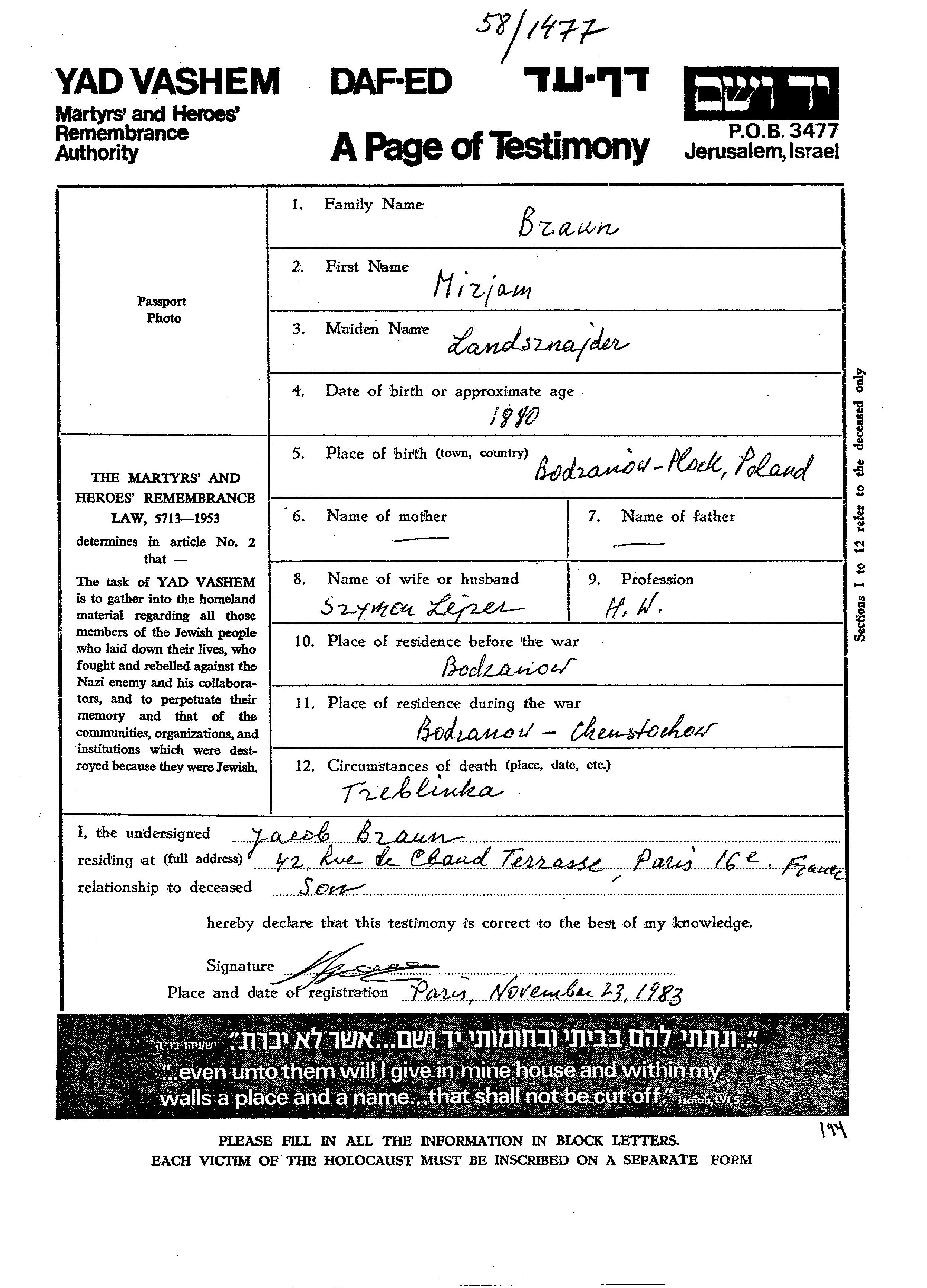 Мирьям Браун, девичья фамилия Ландшнайдер, место рождения: Бодзанов, Польша. Домохозяйка. Женат / замужем. Место жительства до войны: Бодзанов, Польша. Место во время войны: Бодзанов, Польша.