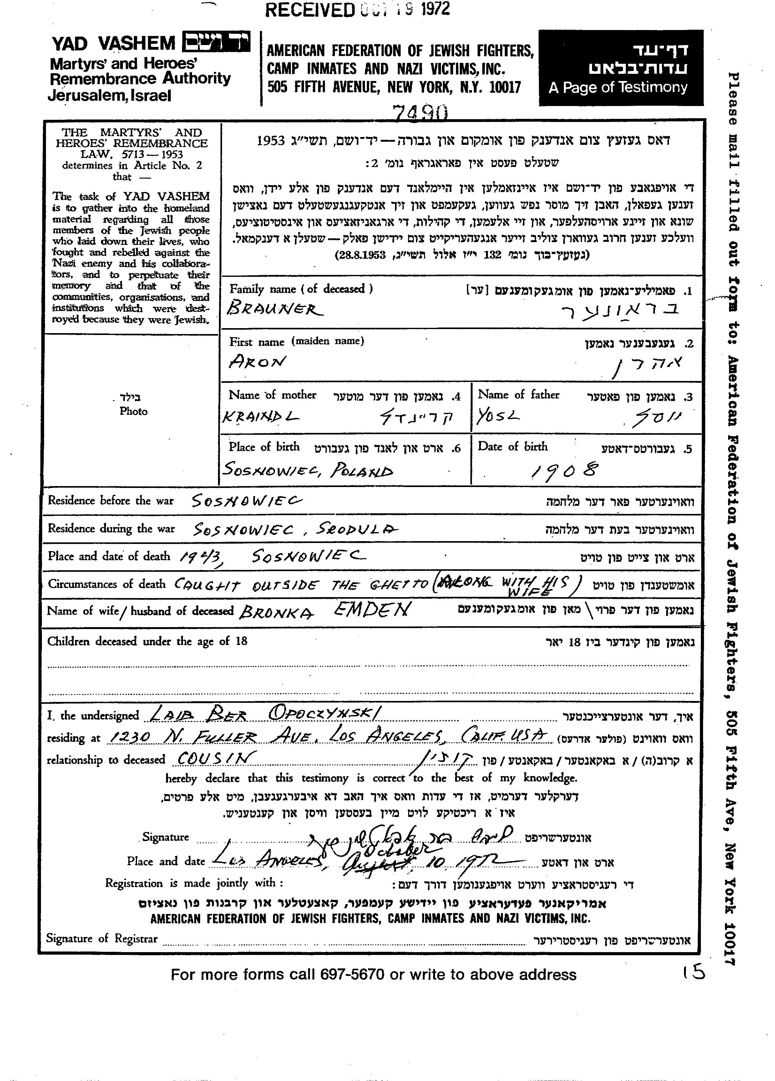 Браунер Арон 1908 Сосновец, Польша Лист свидетельских показаний