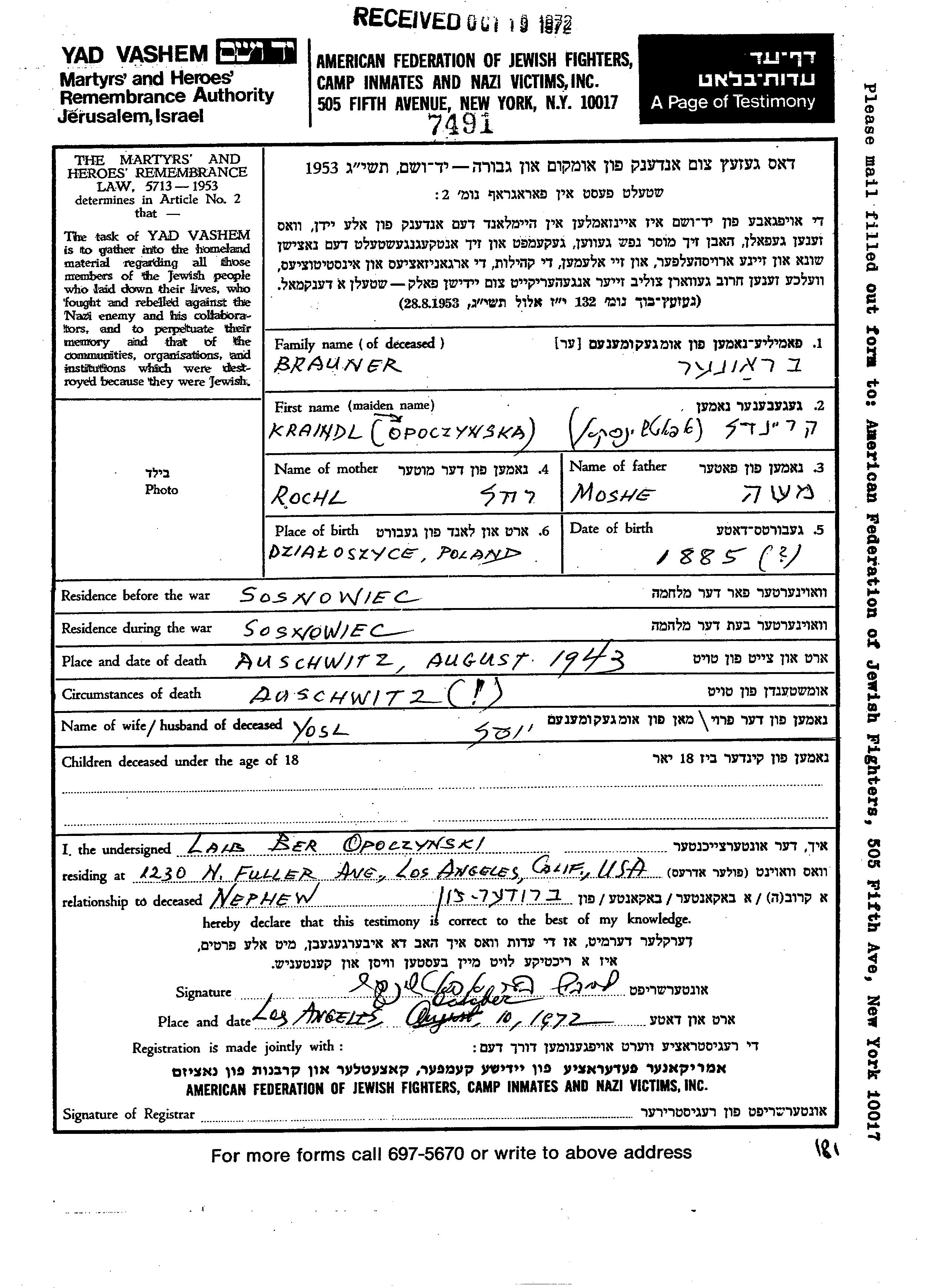 Крайндл Браунер, девичья фамилия Опочинска, место рождения: Дзялошице, Польша. Отец: Моше, mать:Рохл. Женат / замужем. Место жительства до войны: Сосновец, Польша. Место во время войны: Аушвиц, Польша.