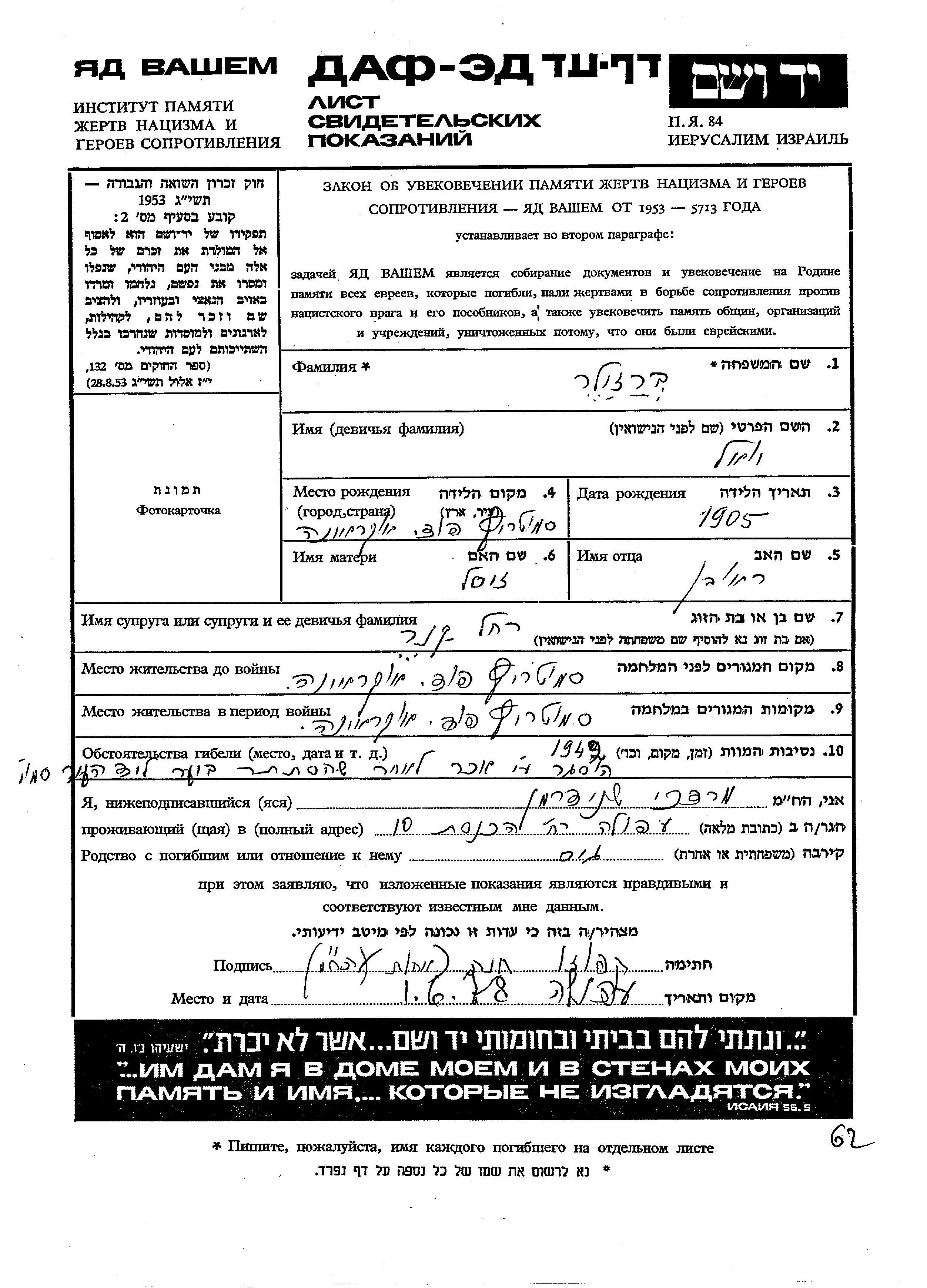 Яд Вашем - Листы свидетельских показаний Мемориального фонда