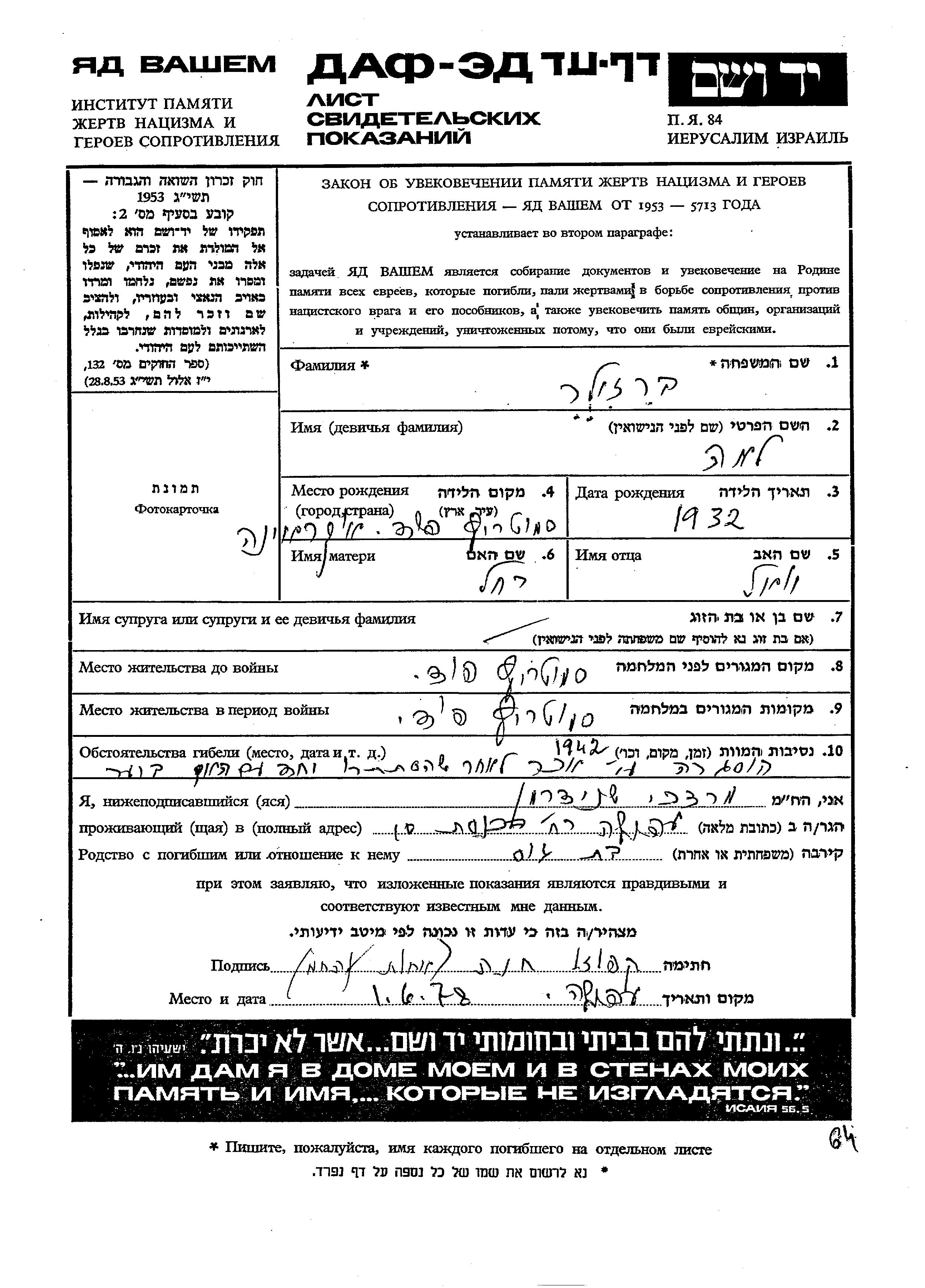 Яд Вашем - Листы свидетельских показаний Мемориального фонда