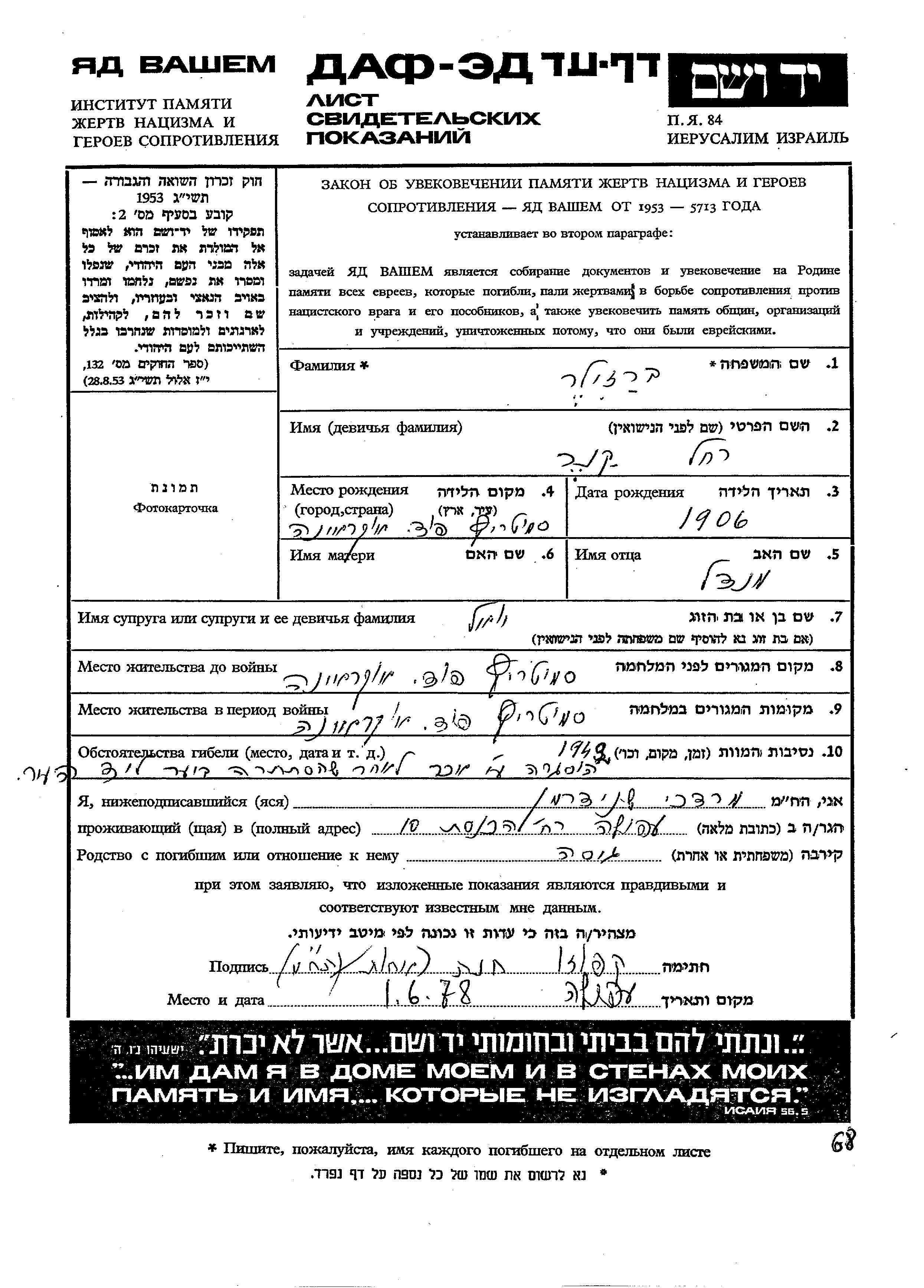 Бразилер Рахель 1906 Смотрич, Украина (СССР) Лист свидетельских показаний
