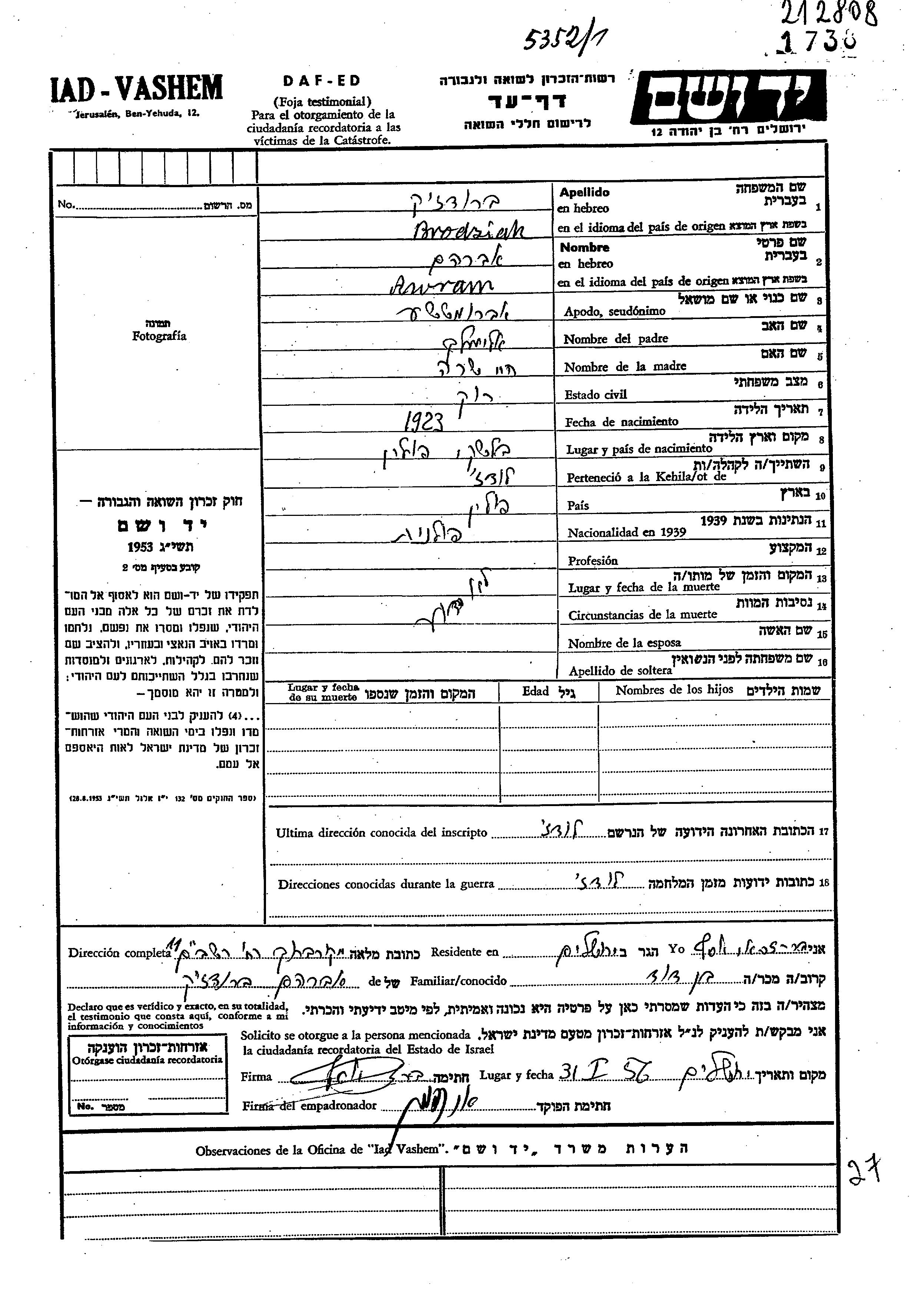 Бродзяк Бродзик Аврам 1923 Лодзь, Польша Лист свидетельских показаний
