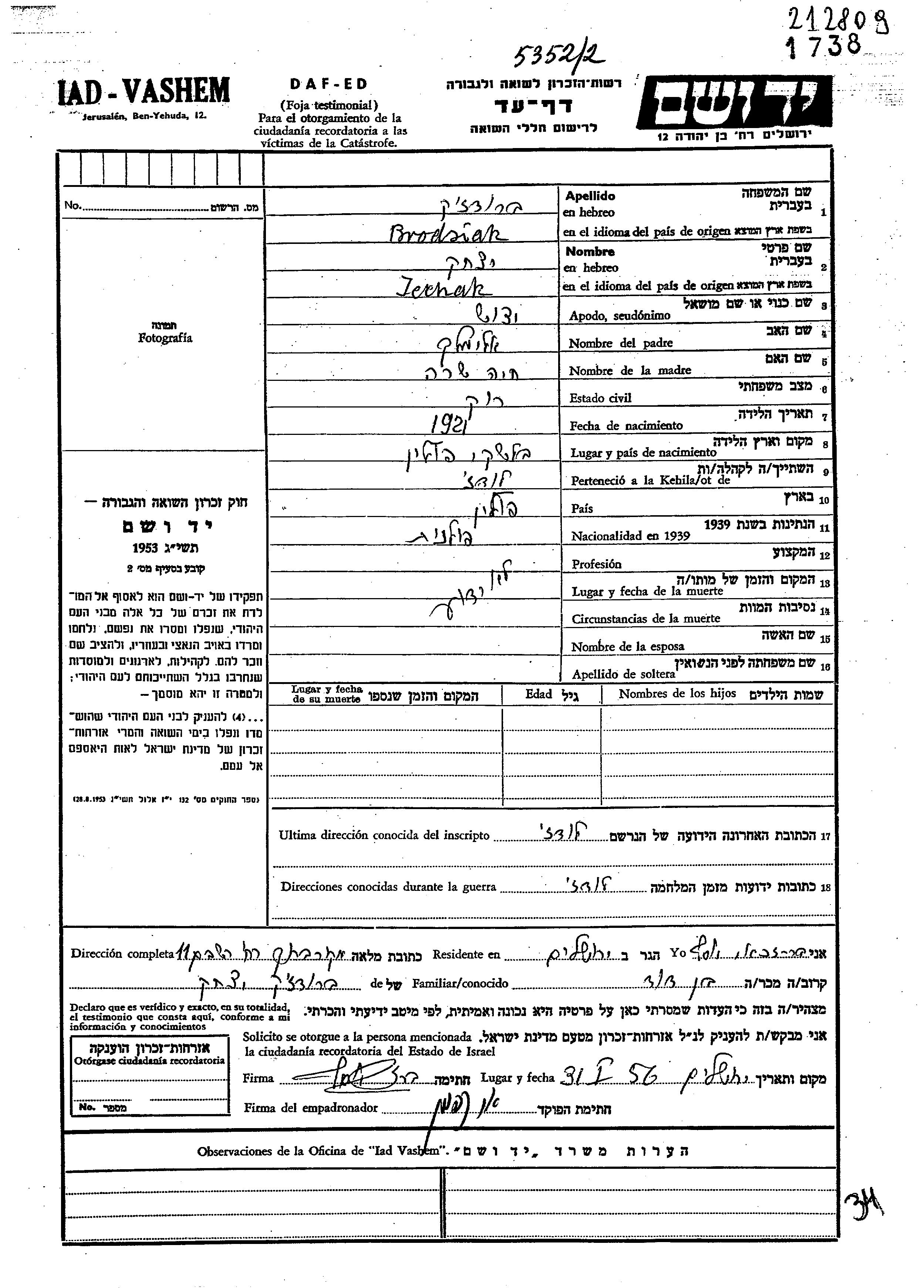 Бродзяк Бродзик Идуш Ицхак 1921 Лодзь, Польша Лист свидетельских показаний