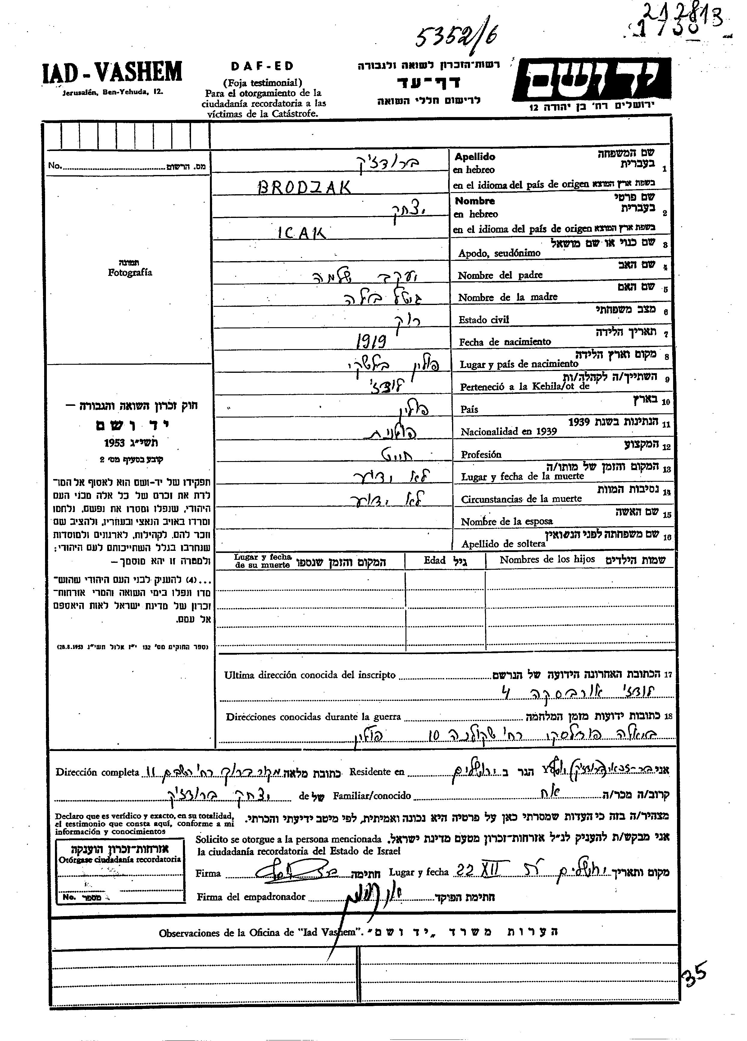 Бродзяк Ицак 1919 Лодзь, Польша Лист свидетельских показаний