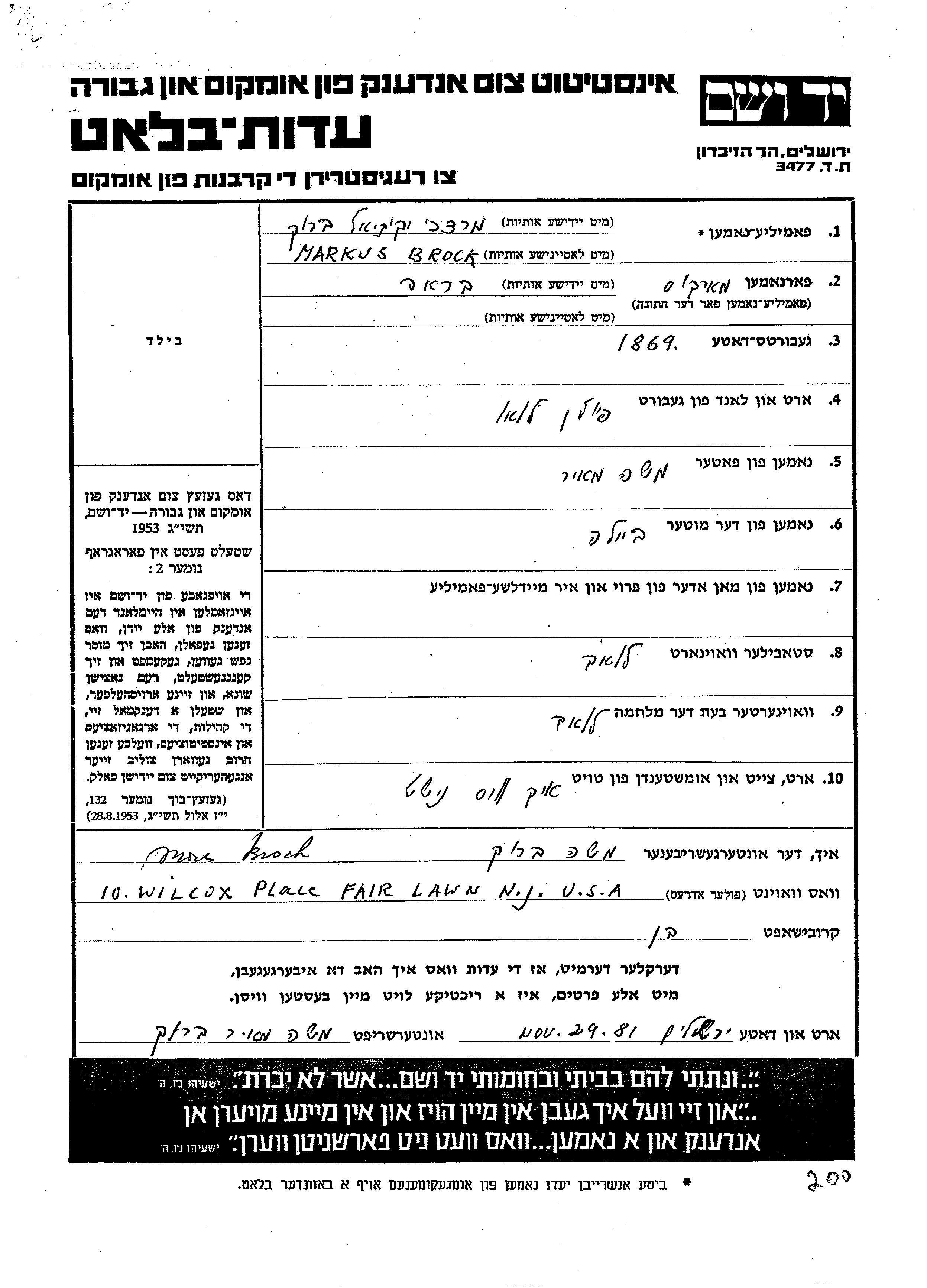 Маркус Иекутиэль Мордехай Брок, место рождения: Львов, Польша. Отец: Меир Моше, mать:Бейла. Место жительства до войны: Львов, Польша. Место во время войны: Львов, Польша.
