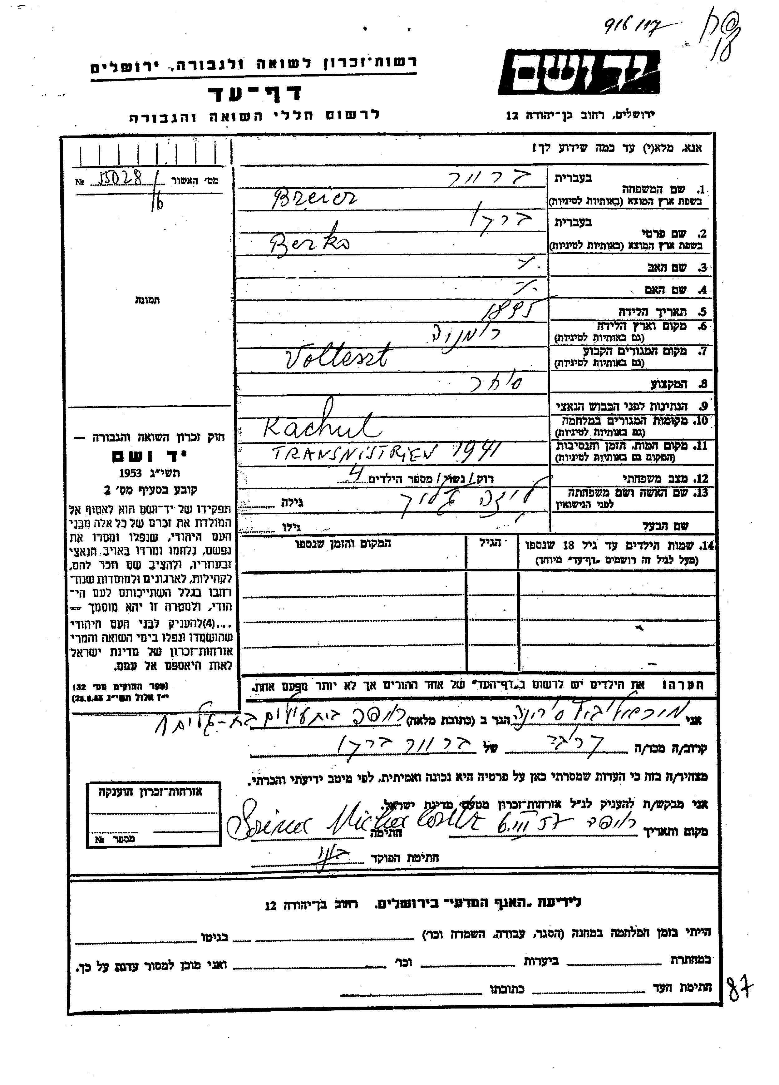 Брейер Берко 1895 Волтешть, Румыния Лист свидетельских показаний