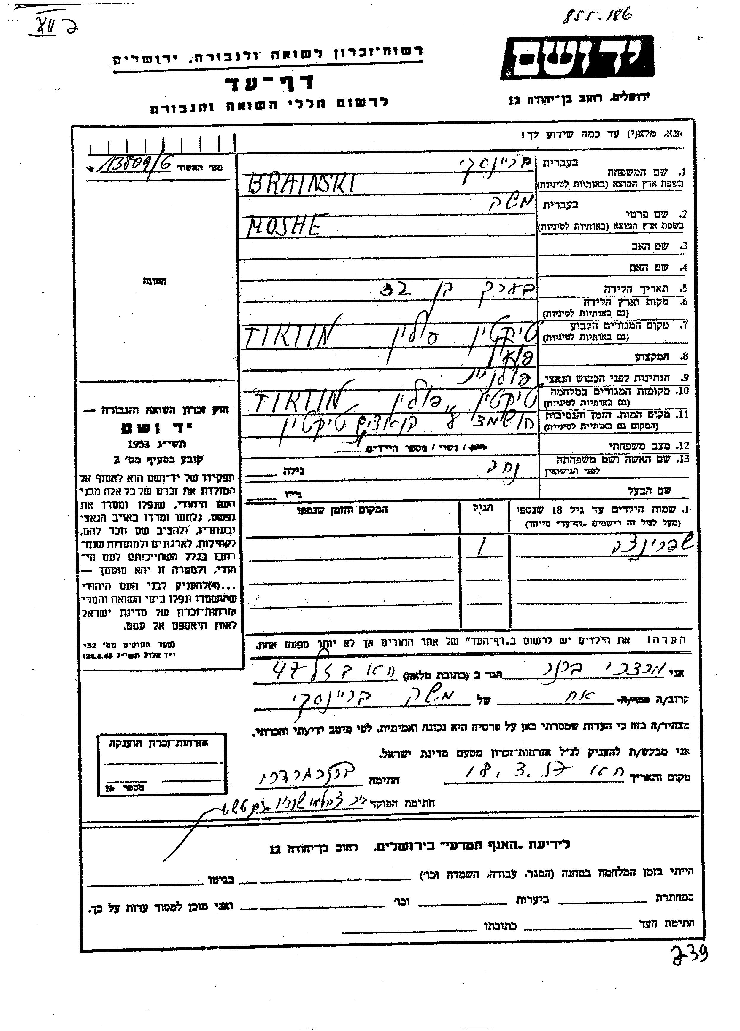 Моше Брейнски. Рабочий / рабочая. Женат / замужем. Место жительства до войны: Тыкоцин, Польша. Место во время войны: Тыкоцин, Польша.