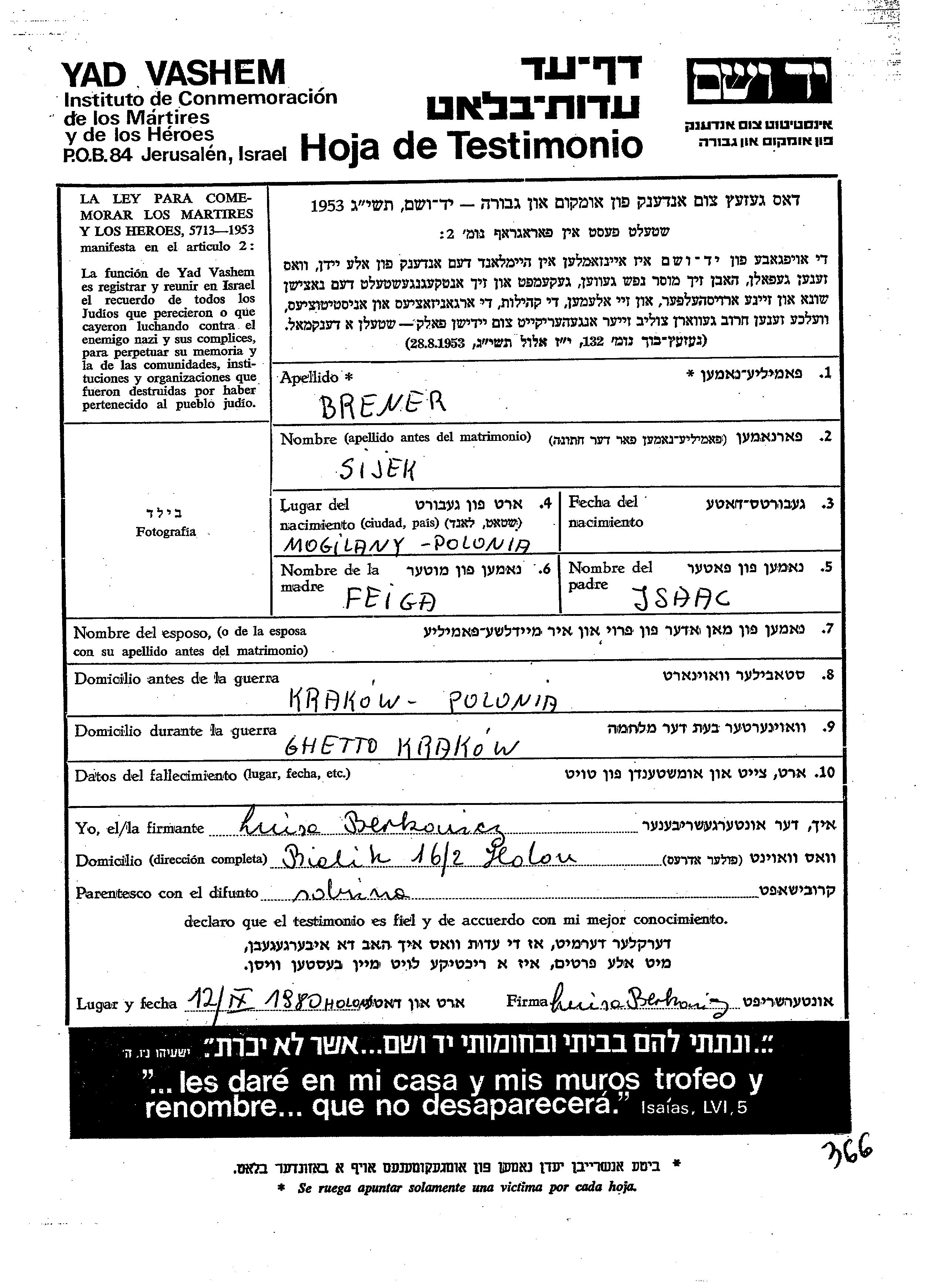 Сиек Бренер, место рождения: Могиланы, Польша. Отец: Исаак, mать:Фейга. Место жительства до войны: Краков, Польша. Место во время войны: Краков, Польша.