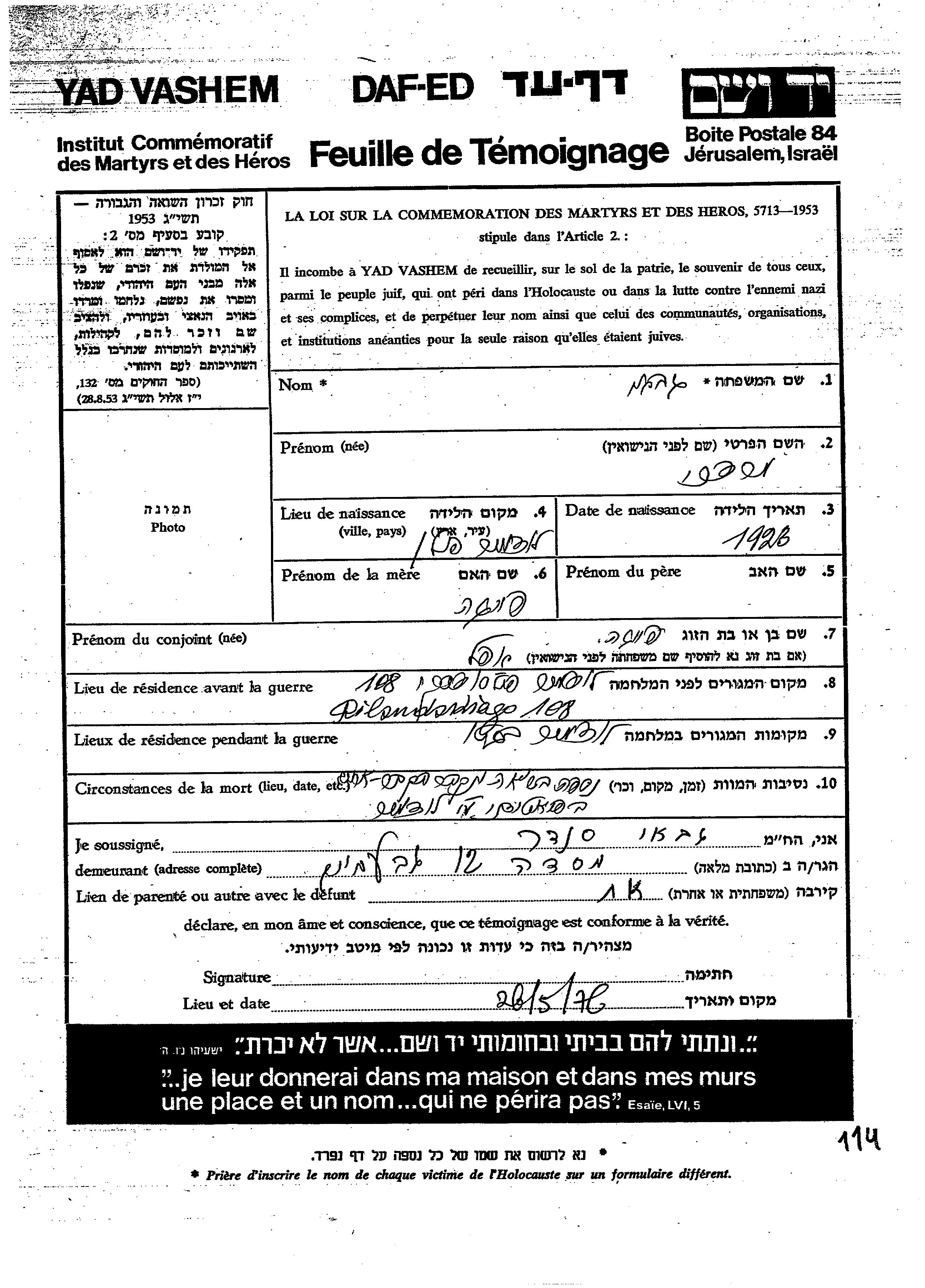 Габай Мордехай 1926 Людмир, Польша Лист свидетельских показаний