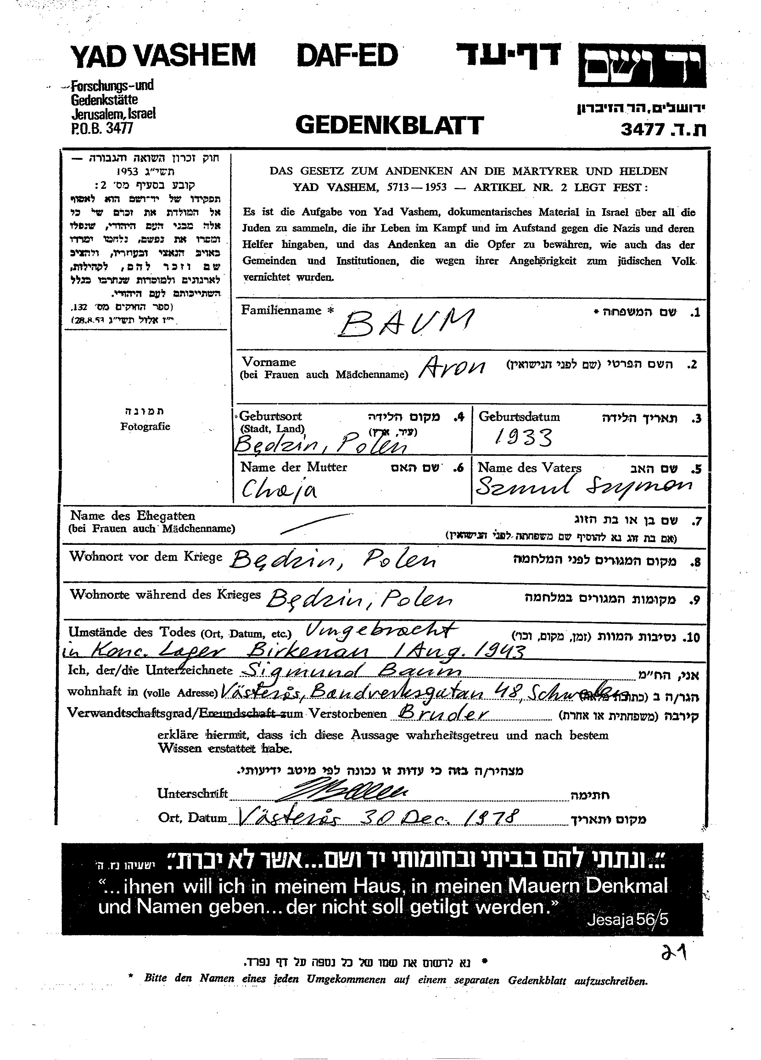 Арон Баум, место рождения: Бендзин, Польша. Отец: Шмуэль Шимон, mать:Хая. Место жительства до войны: Бендзин, Польша. Место во время войны: Бендзин, Польша.