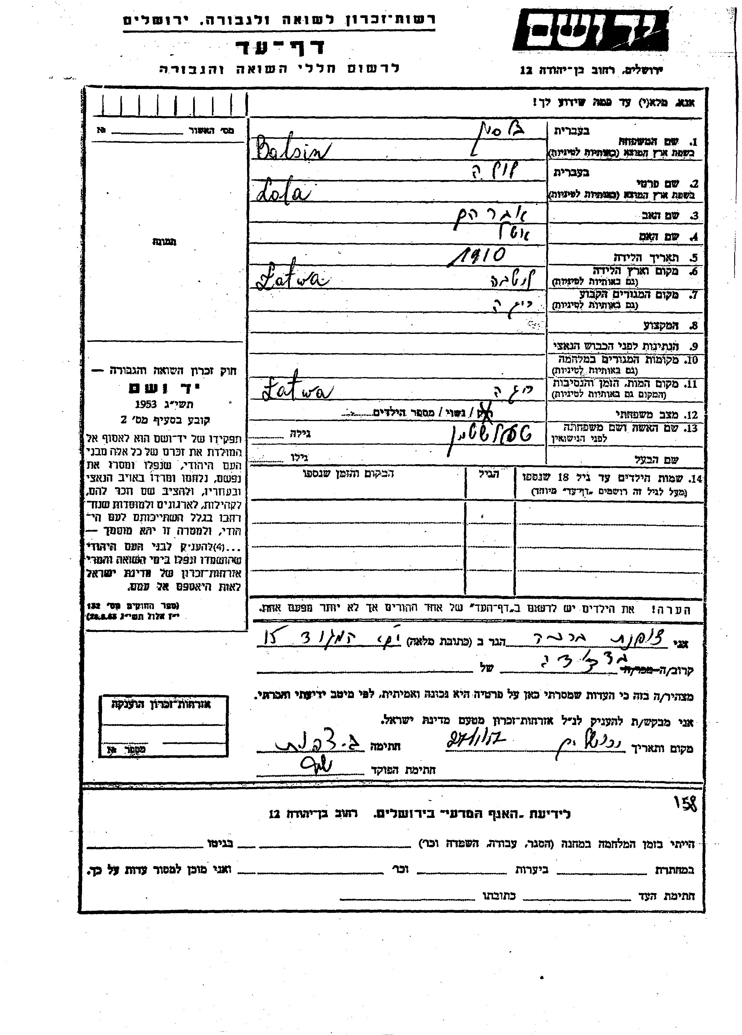 Бальсин Лола 1910 Рига, Латвия Лист свидетельских показаний