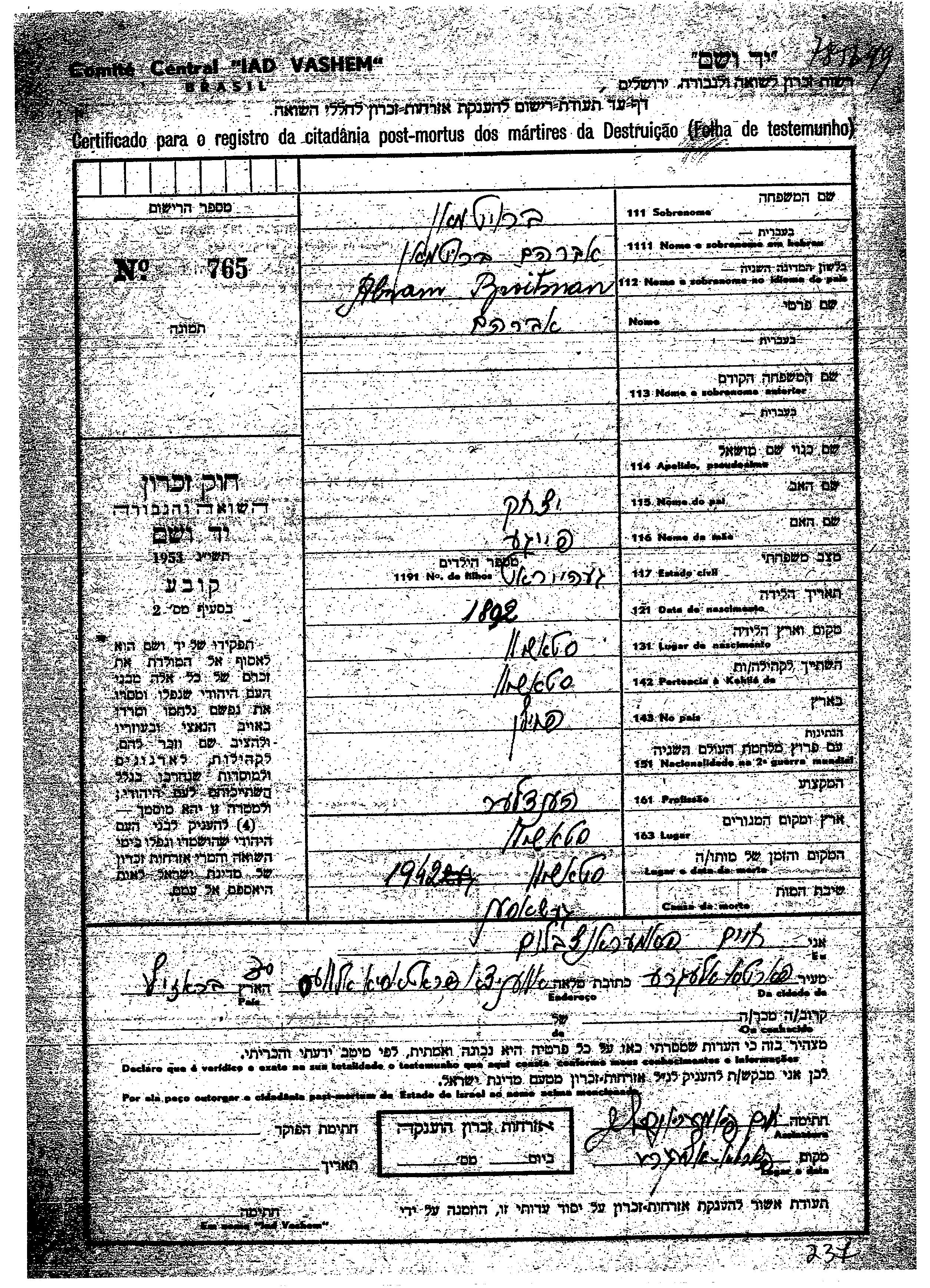 Абрам Бройтман, место рождения: Сташув, Польша. Отец: Ицхак, mать:Фейге. Торговец / торговка. Женат / замужем. Место жительства до войны: Сташув, Польша. Место во время войны: Сташув, Польша.