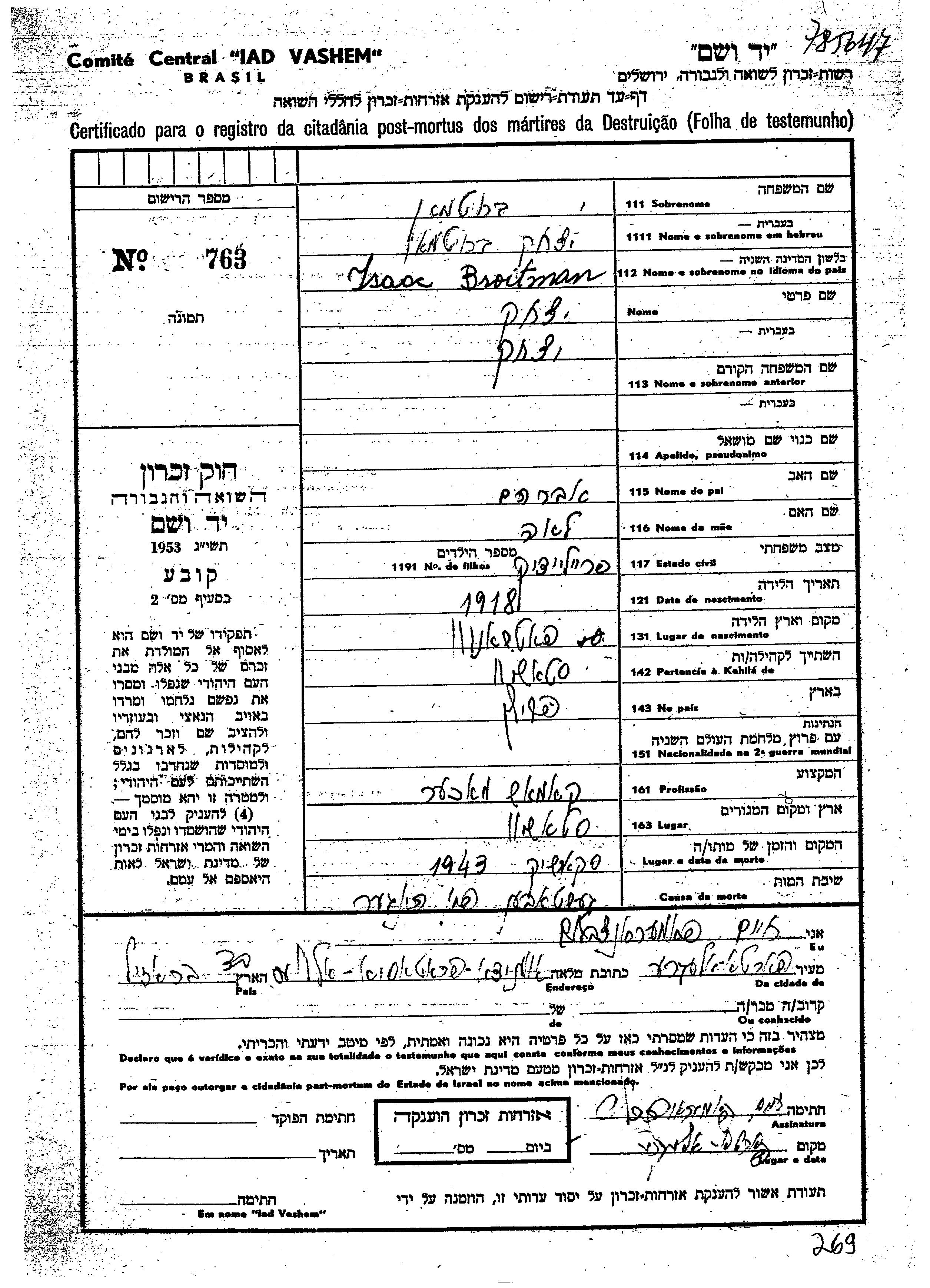 Бройтман Исаак 1918 Сташив, Польша Лист свидетельских показаний