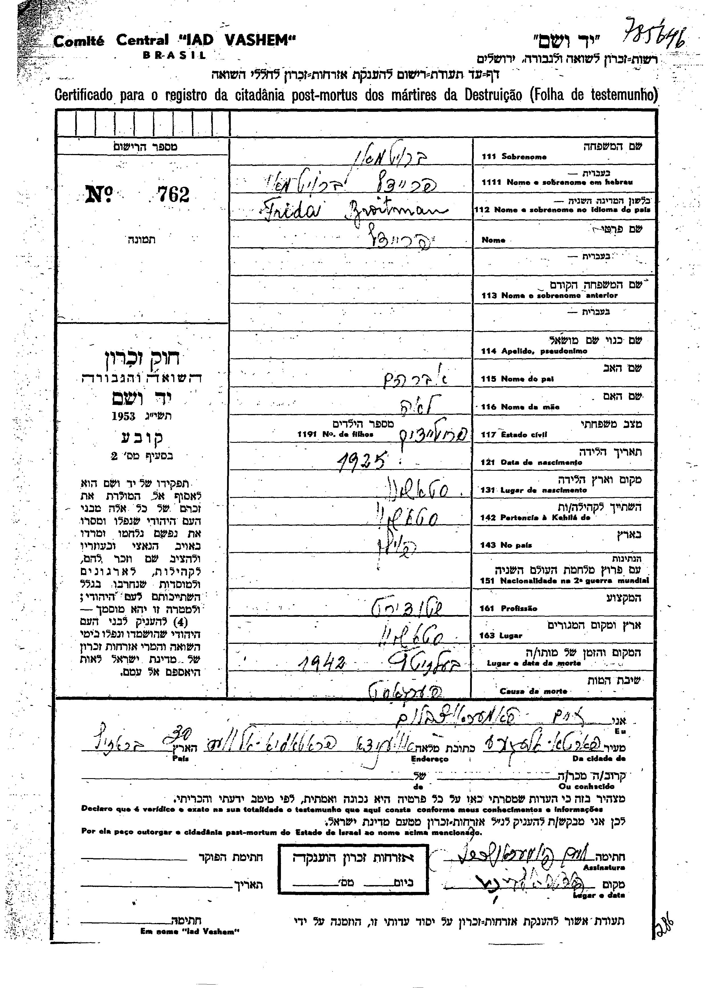 Бройтман Фридаль Фрейдел 1925 Сташив, Польша Лист свидетельских показаний
