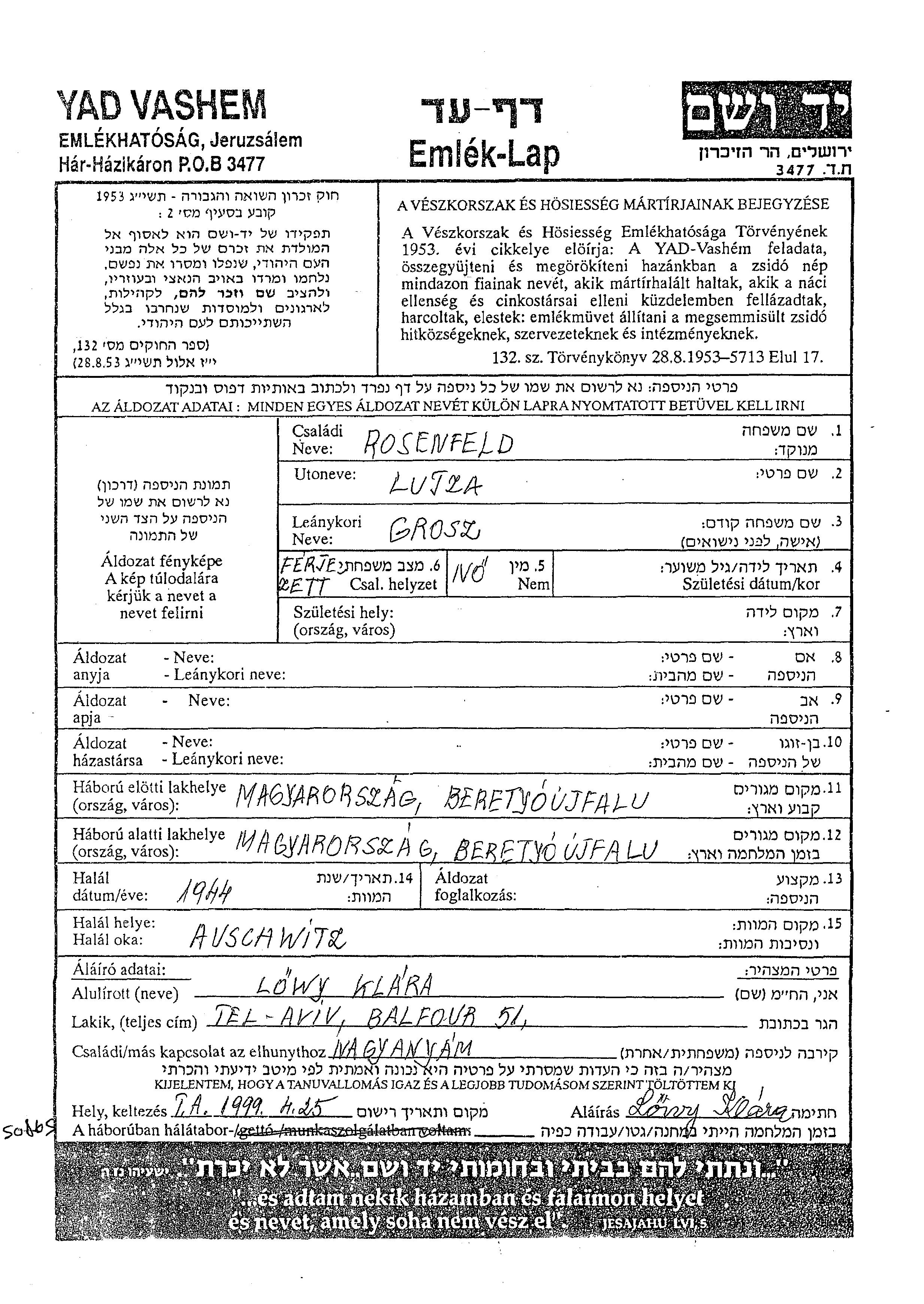 Луиза Розенфельд, девичья фамилия Грос. Женат / замужем. Место жительства до войны: Беретьоуйфалу, Венгрия. Место во время войны: Беретьоуйфалу, Венгрия.