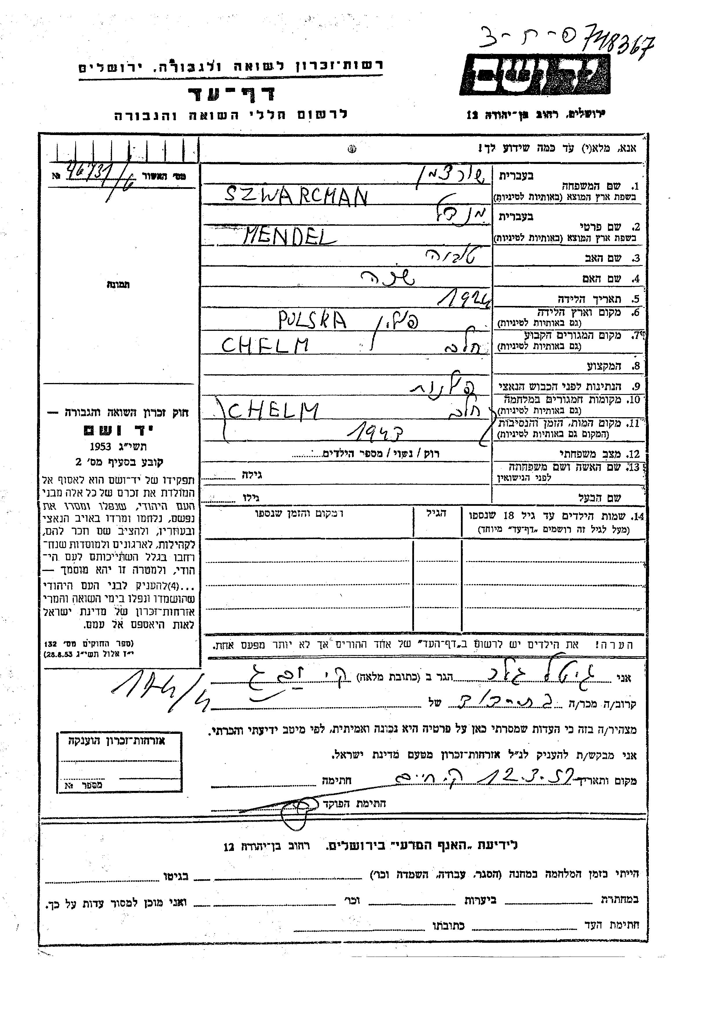 Шварцман Мендель 1924 Хелм, Польша Лист свидетельских показаний
