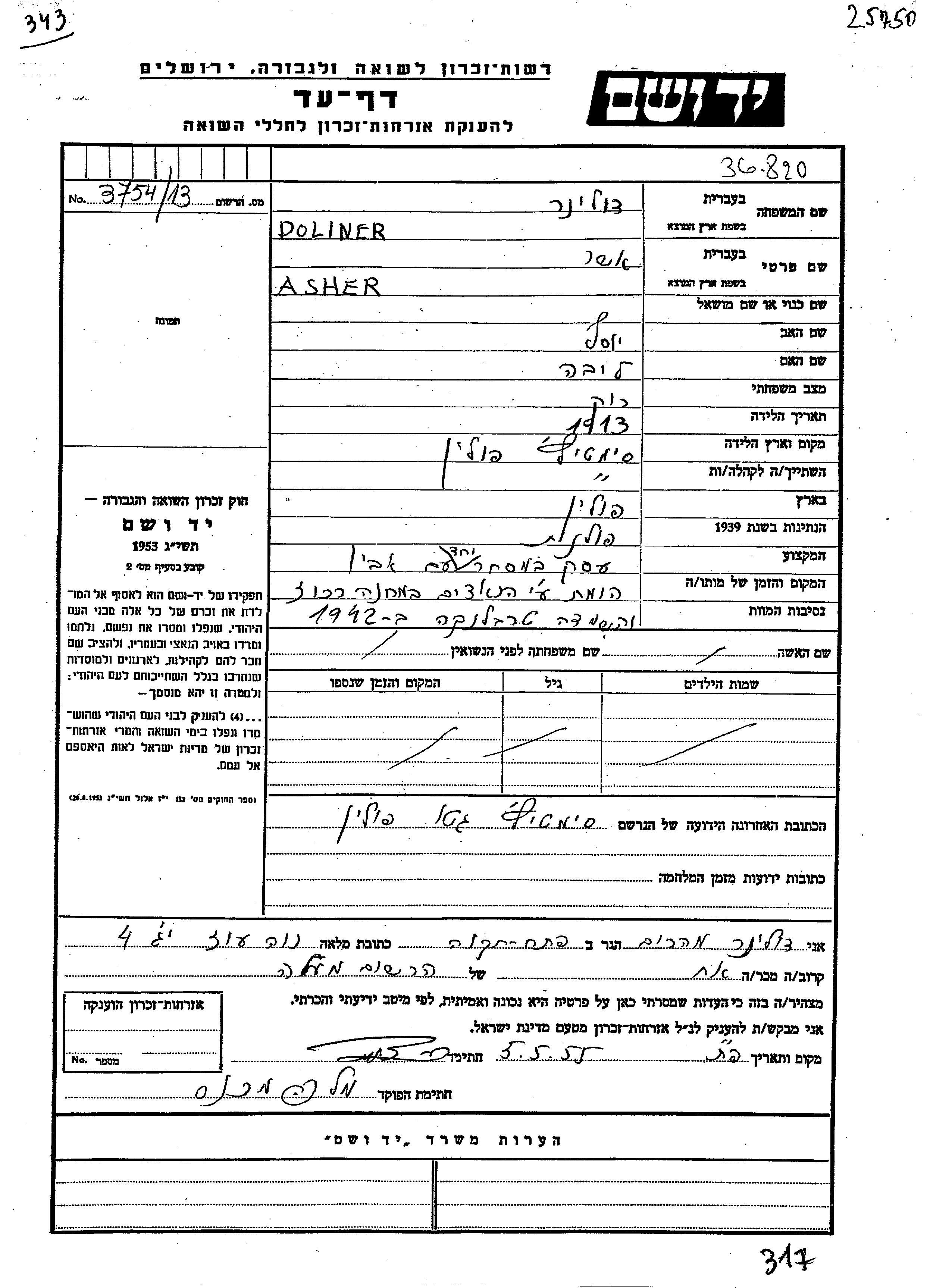 Ашер Долинер, место рождения: Семятыче, Польша. Отец: Иосеф, mать:Либа. Торговец / торговка. Холост / не замужем. Место жительства до войны: Семятыче, Польша. Место во время войны: Семятыче, Польша.