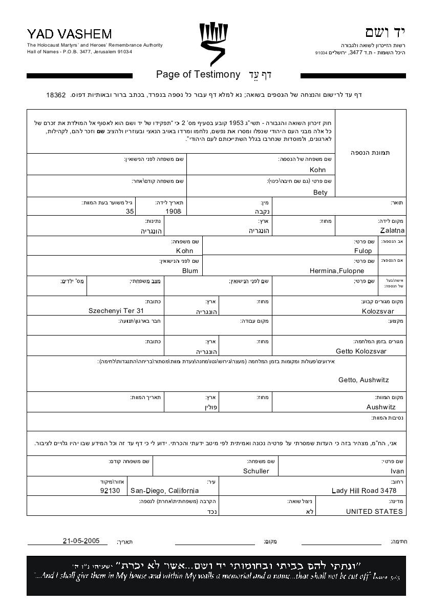 Бети Кон, место рождения: Залата, Венгрия. Отец: Фюлёп, mать:Хермина, девичья фамилия Блум. Место жительства до войны: Коложвар, Румыния. Место во время войны: Коложвар, Румыния.