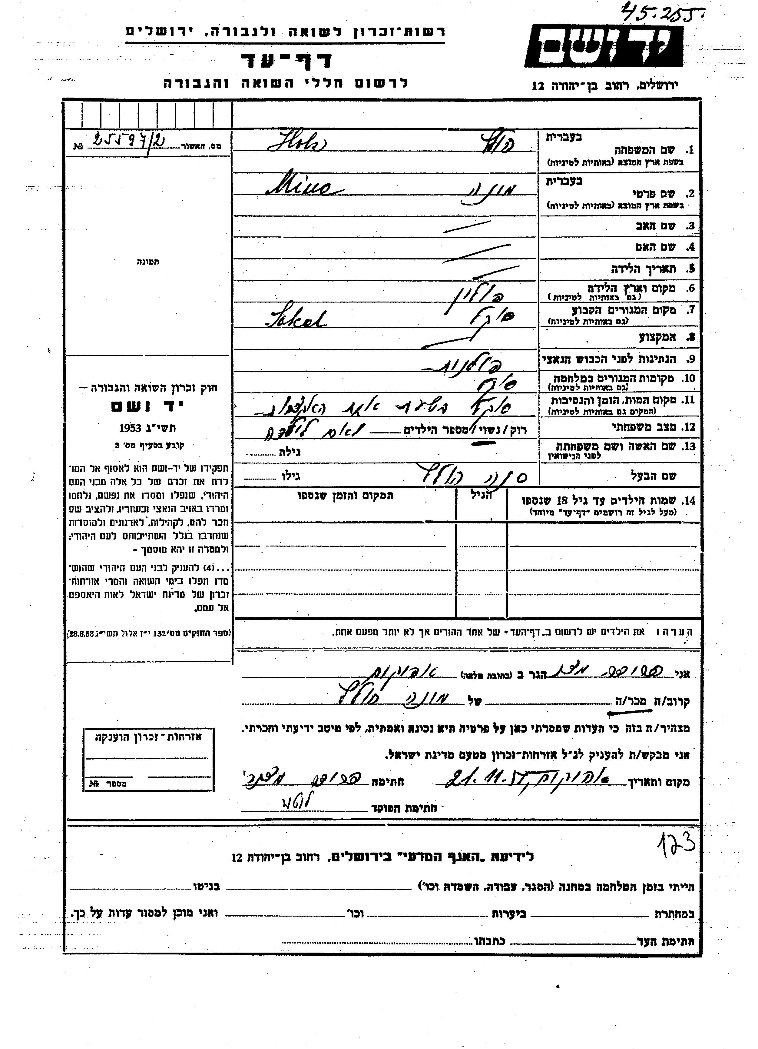 Яд Вашем - Листы свидетельских показаний Мемориального фонда