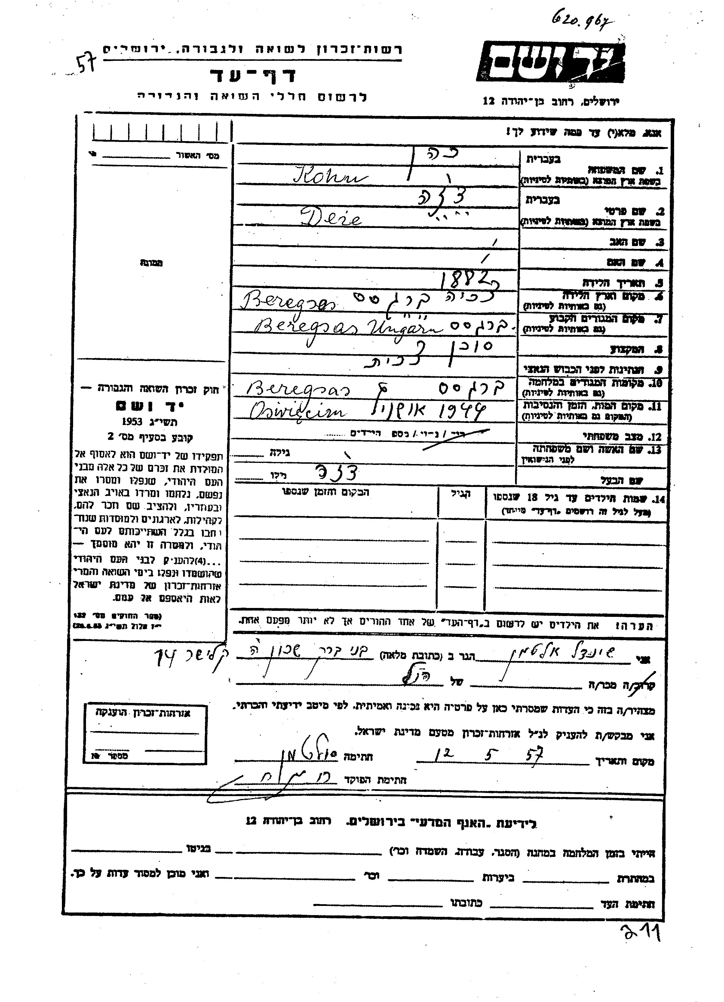 Деже Кон, место рождения: Берегсас, Чехословакия. Агент. Женат / замужем. Место жительства до войны: Берегсас, Чехословакия. Место во время войны: Берегсас, Чехословакия.