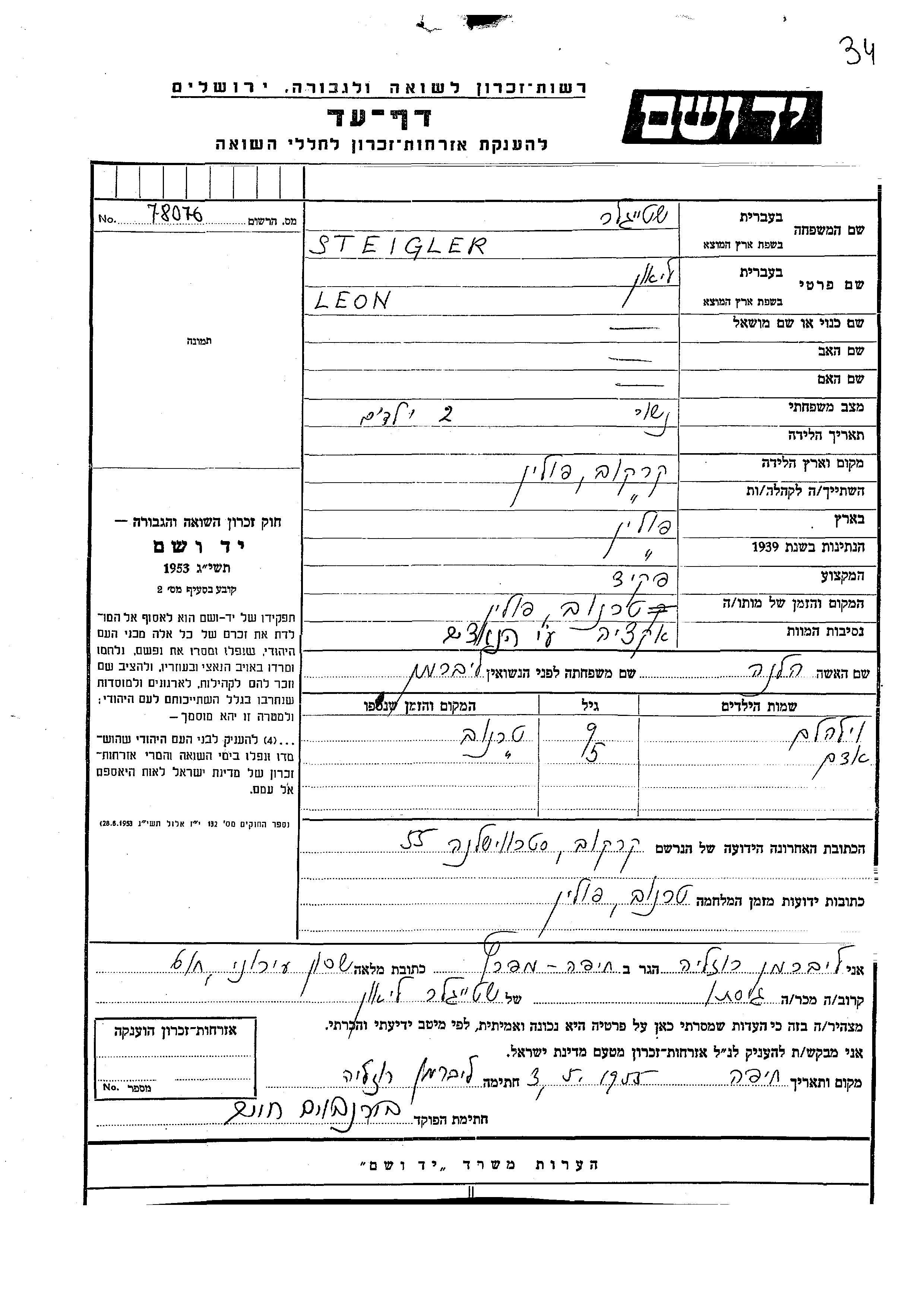 Лион Штайглер, место рождения: Краков, Польша. Клерк. Женат / замужем. Место жительства до войны: Тарнув, Польша. Место во время войны: Тарнув, Польша.