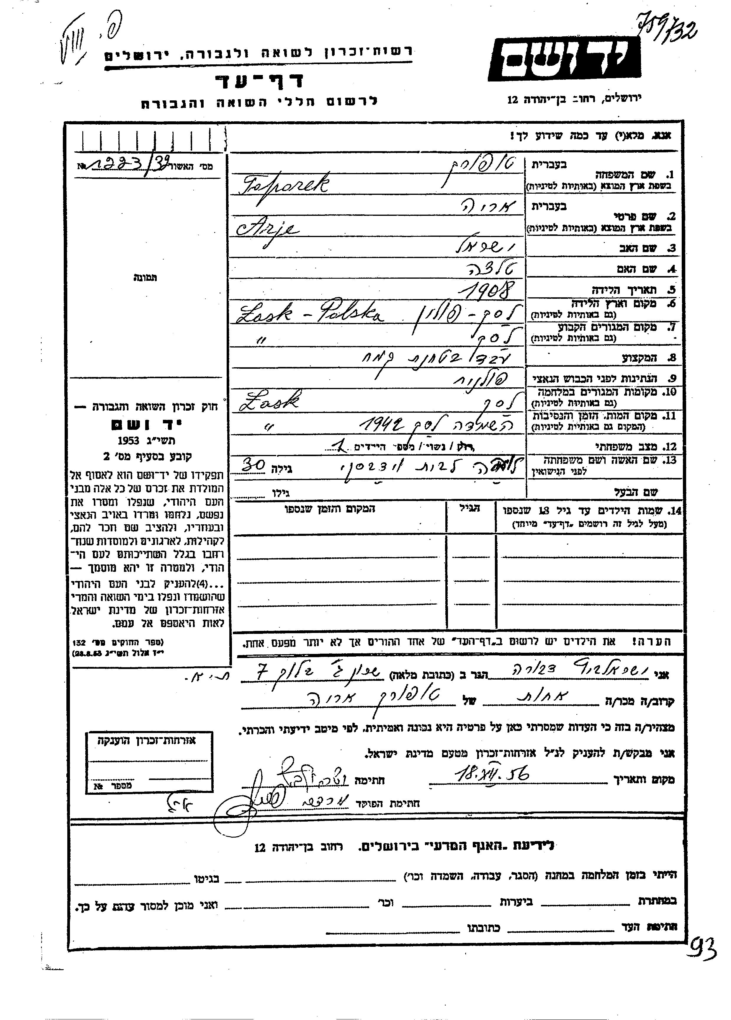 Арье Топорек, место рождения: Ласк, Польша. Отец: Исраэль, mать:Тельца. Рабочий на мельнице. Женат / замужем. Место жительства до войны: Ласк, Польша. Место во время войны: Ласк, Польша.