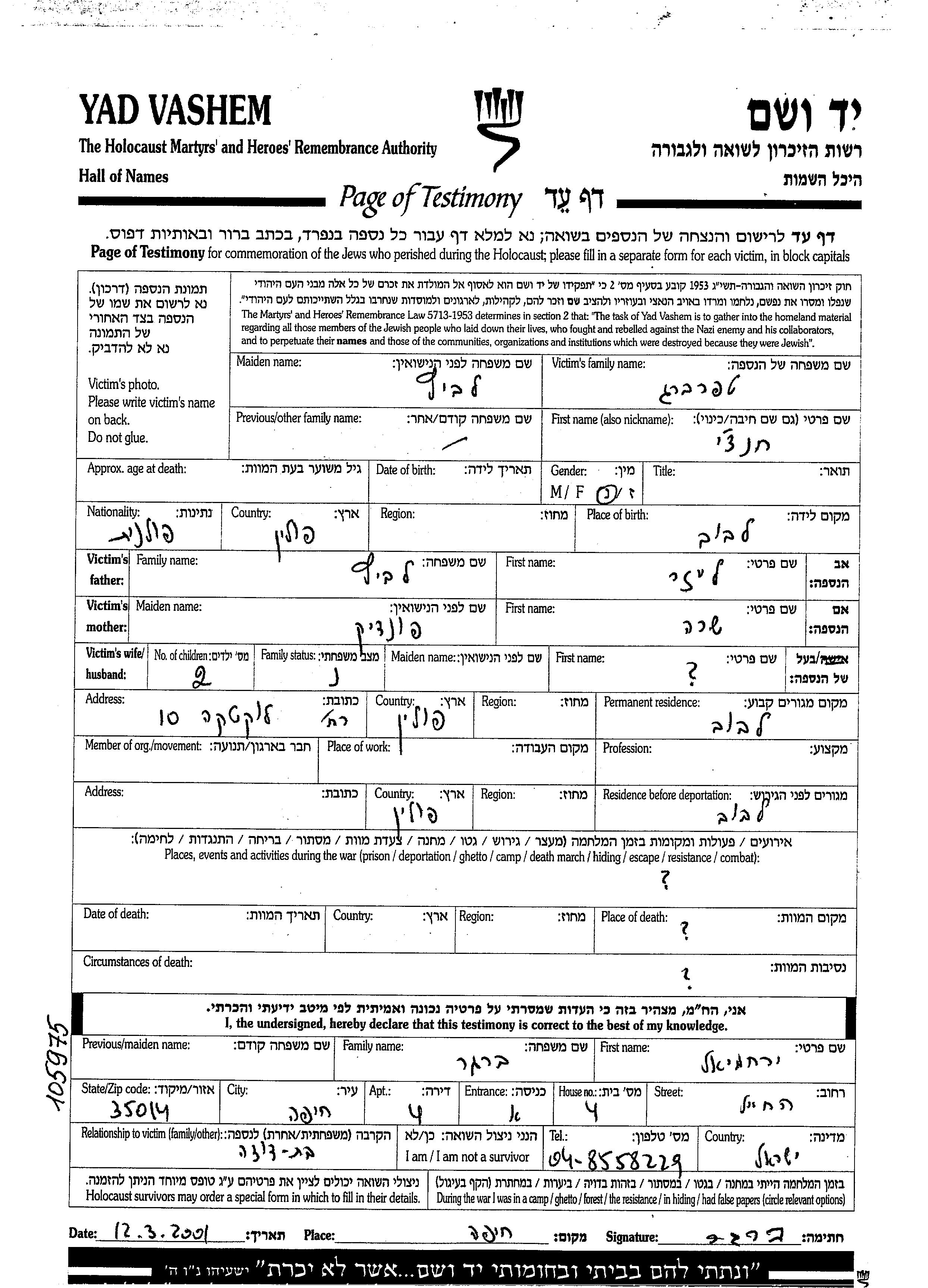 Яд Вашем - Листы свидетельских показаний Мемориального фонда