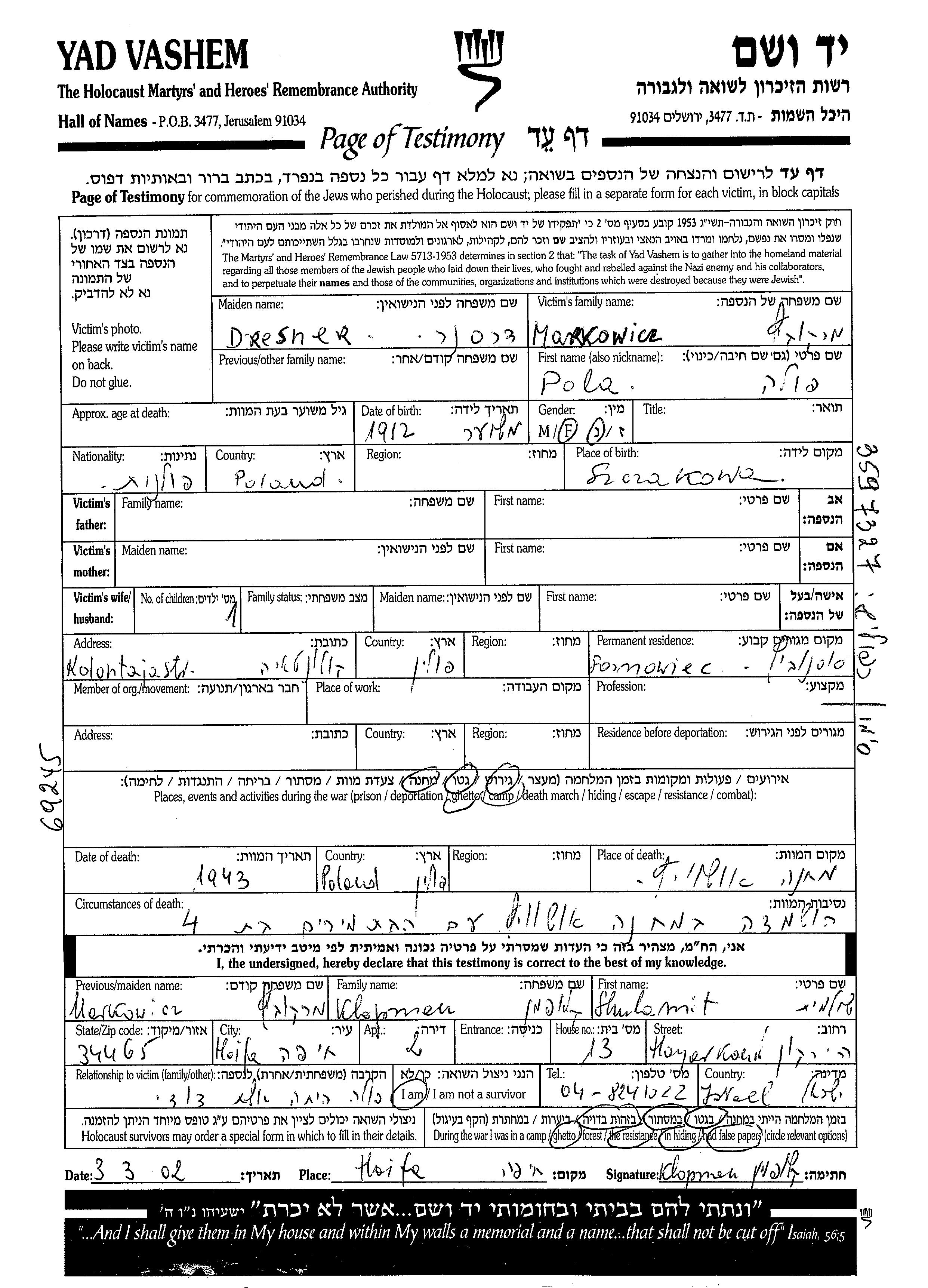 Пола Марковиц, девичья фамилия Дреснер, место рождения: Щакова, Польша. Место жительства до войны: Сосновец, Польша. Место во время войны: ГЕТТО.