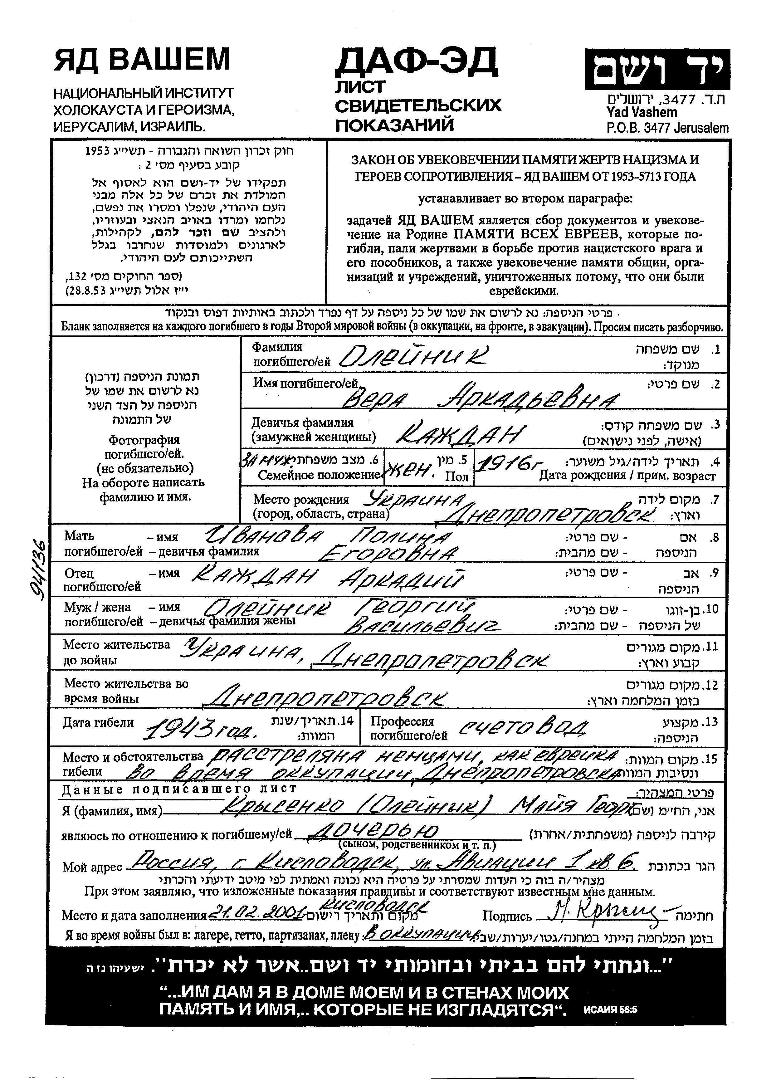 Олейник Вера 1916 Днепропетровск, Украина (СССР) Лист свидетельских показаний