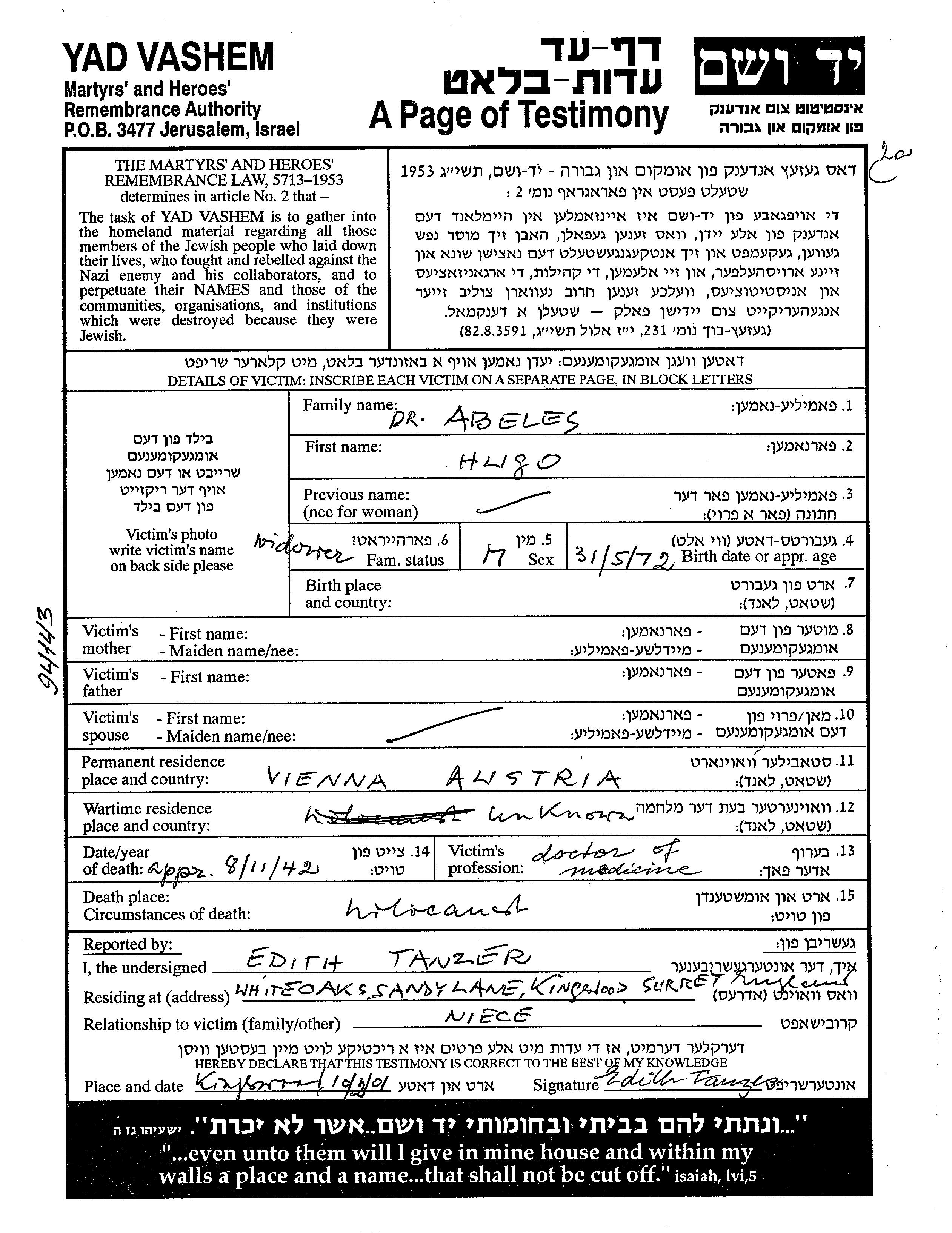 Хуго Абелес. Доктор медицины. Место жительства до войны: Вена, Австрия.