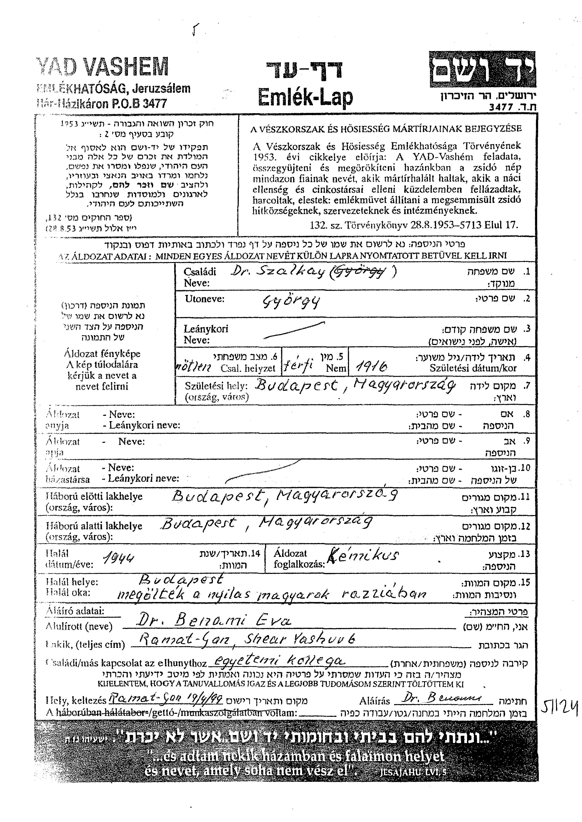 Дьёрдь Салкаи, место рождения: Будапешт, Венгрия. Kemikus. Холост / не замужем. Место жительства до войны: Будапешт, Венгрия. Место во время войны: Будапешт, Венгрия.