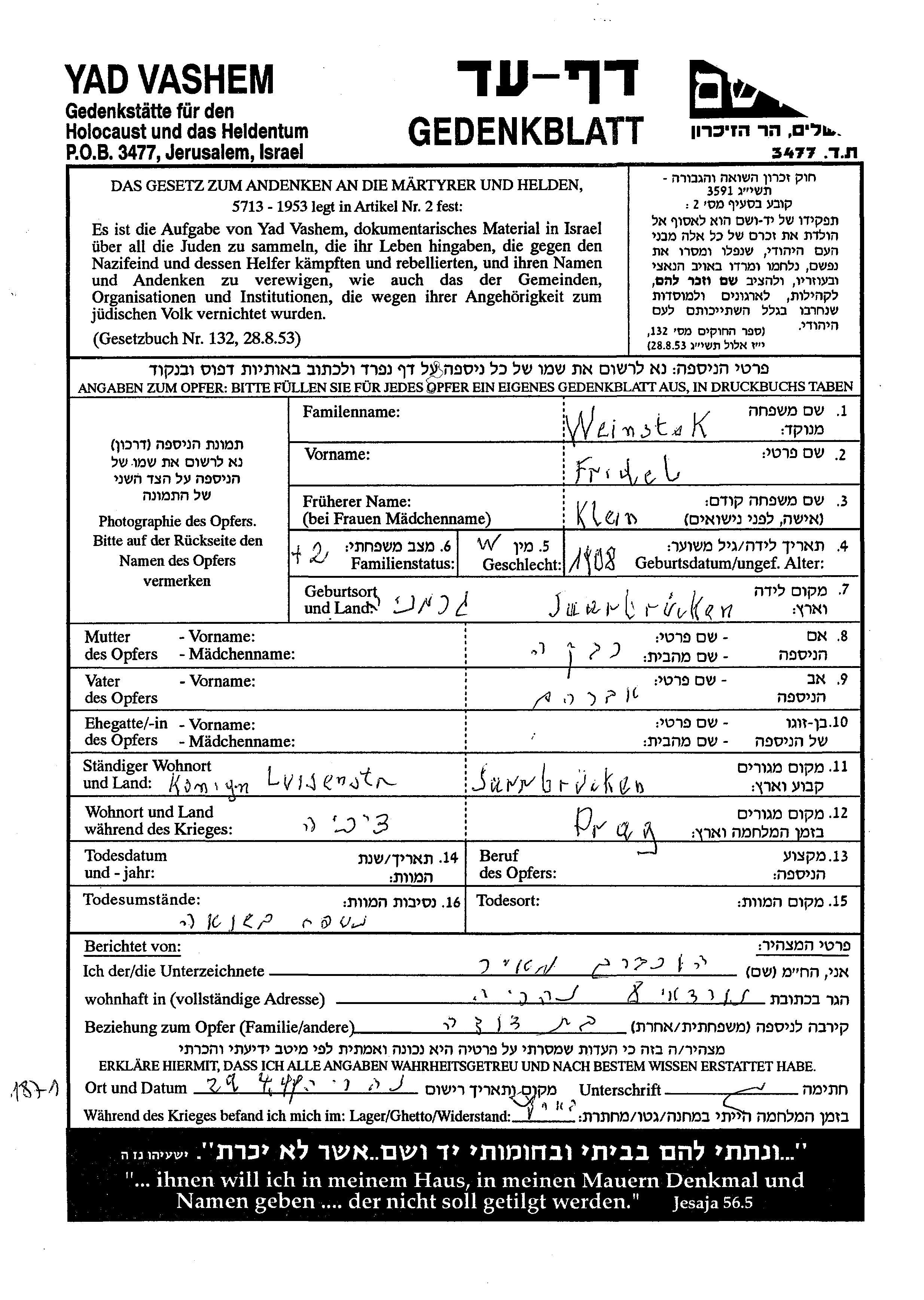 Фридель Вейншток, девичья фамилия Клейн, место рождения: Сарребрюк, Германия. Отец: Авраам, mать:Ривка. Женат / замужем. Место жительства до войны: Сарребрюк, Германия. Место во время войны: Прага, Чехословакия.