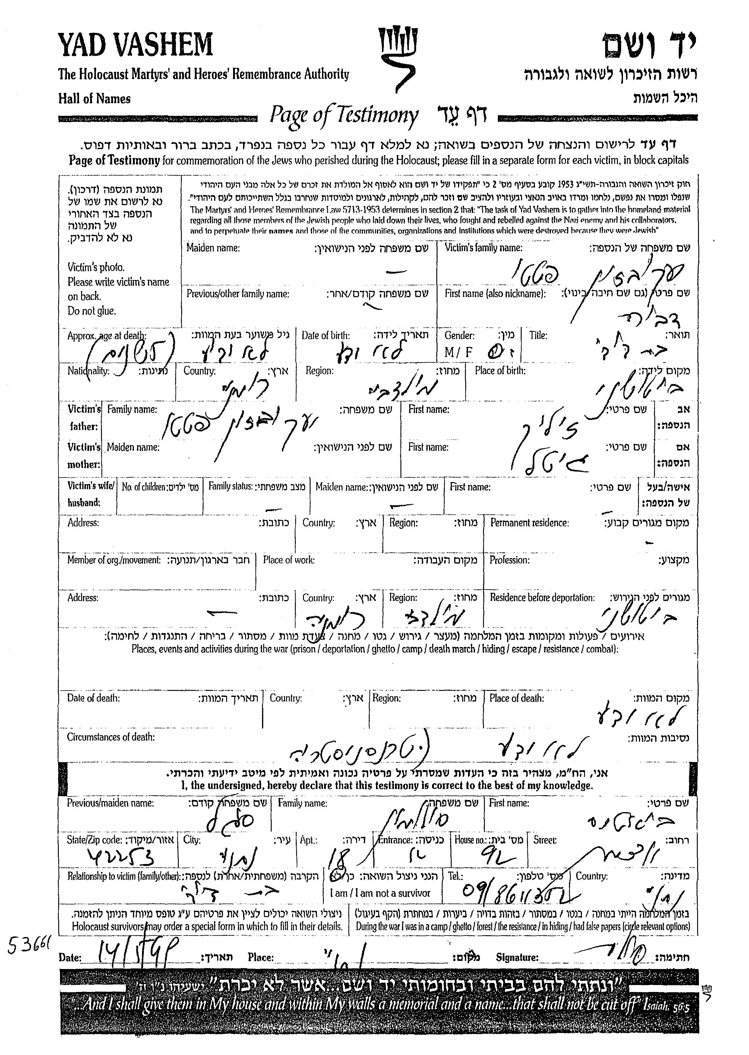 Яд Вашем - Листы свидетельских показаний Мемориального фонда