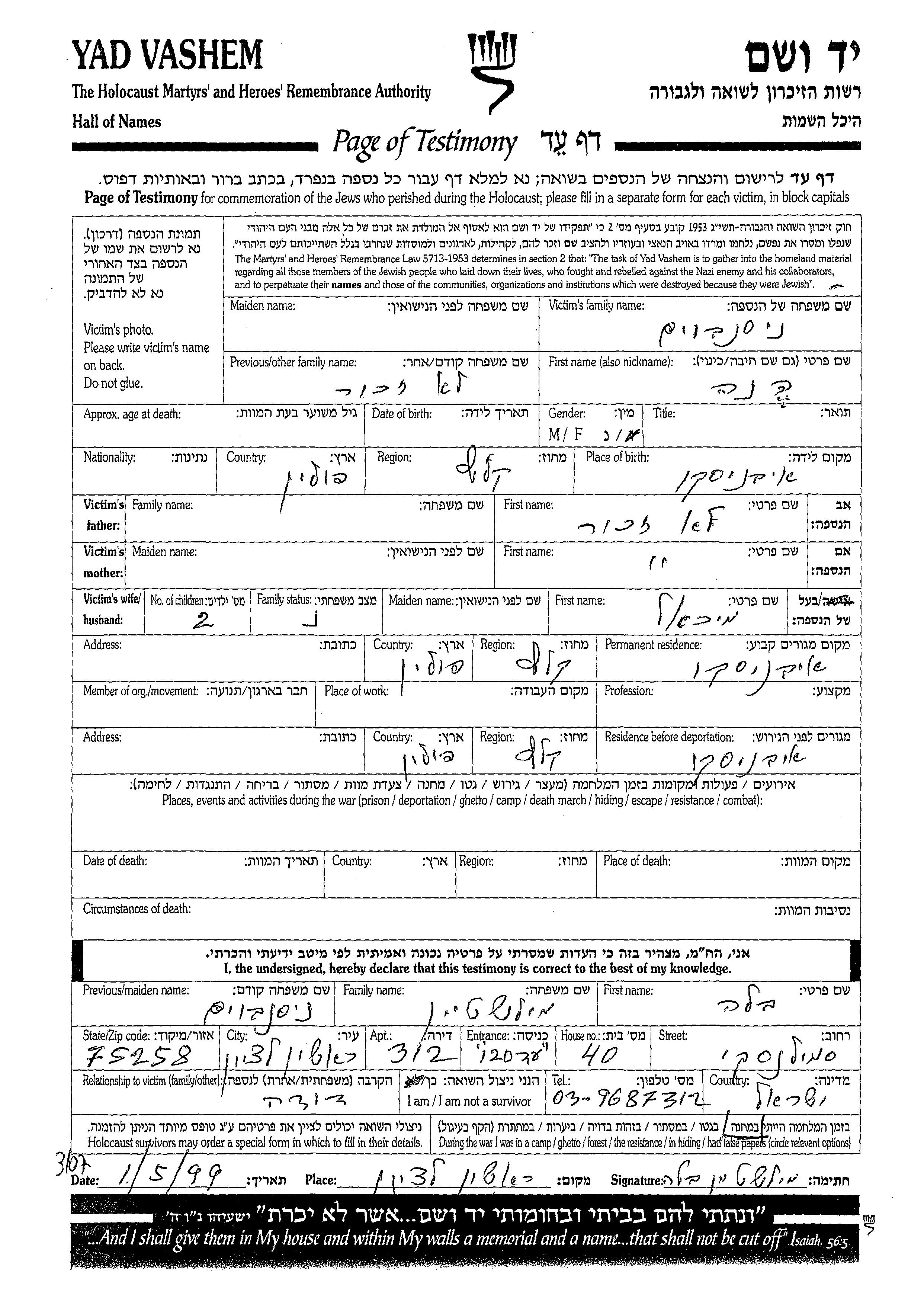 Яд Вашем - Листы свидетельских показаний Мемориального фонда