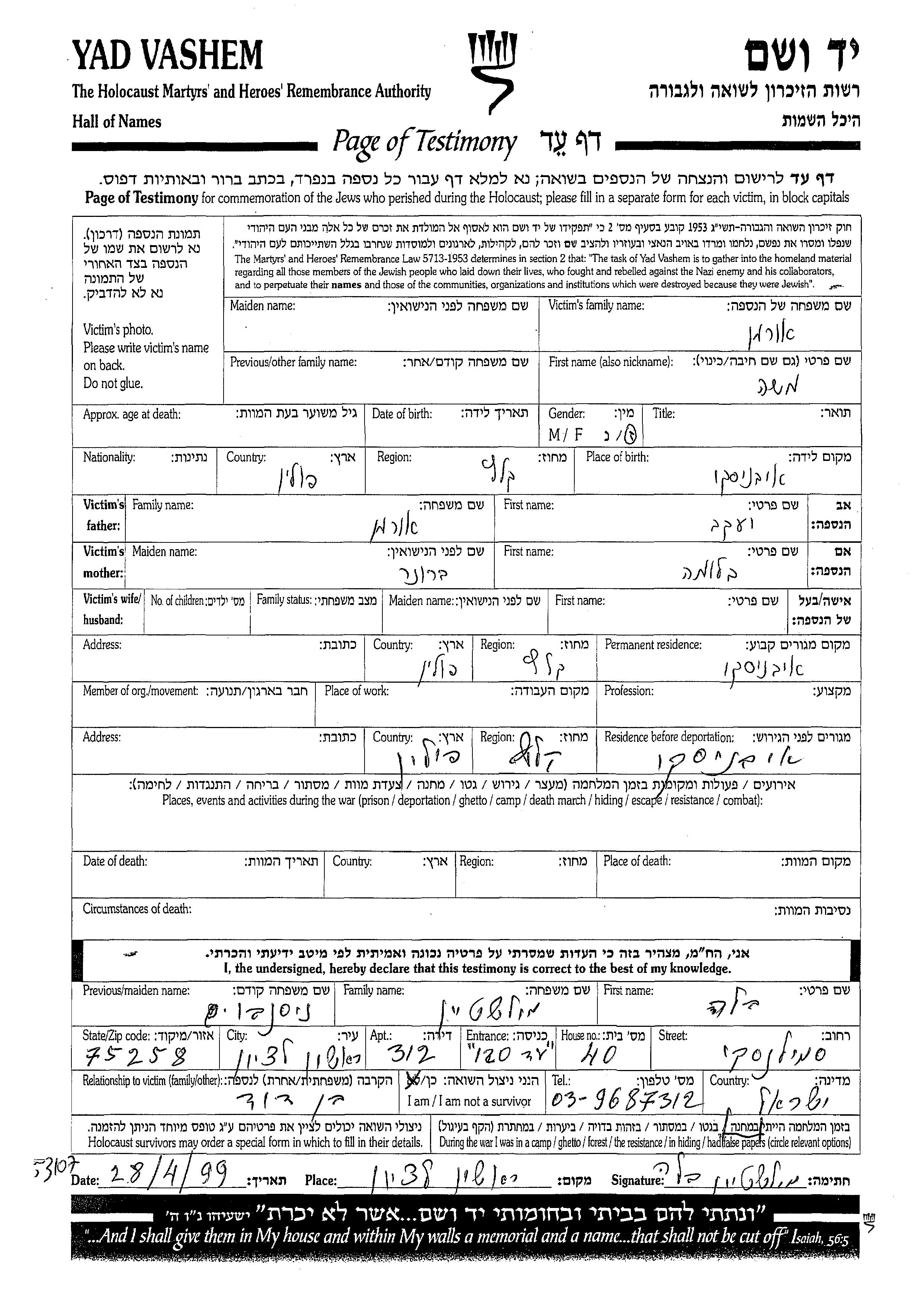 Яд Вашем - Листы свидетельских показаний Мемориального фонда
