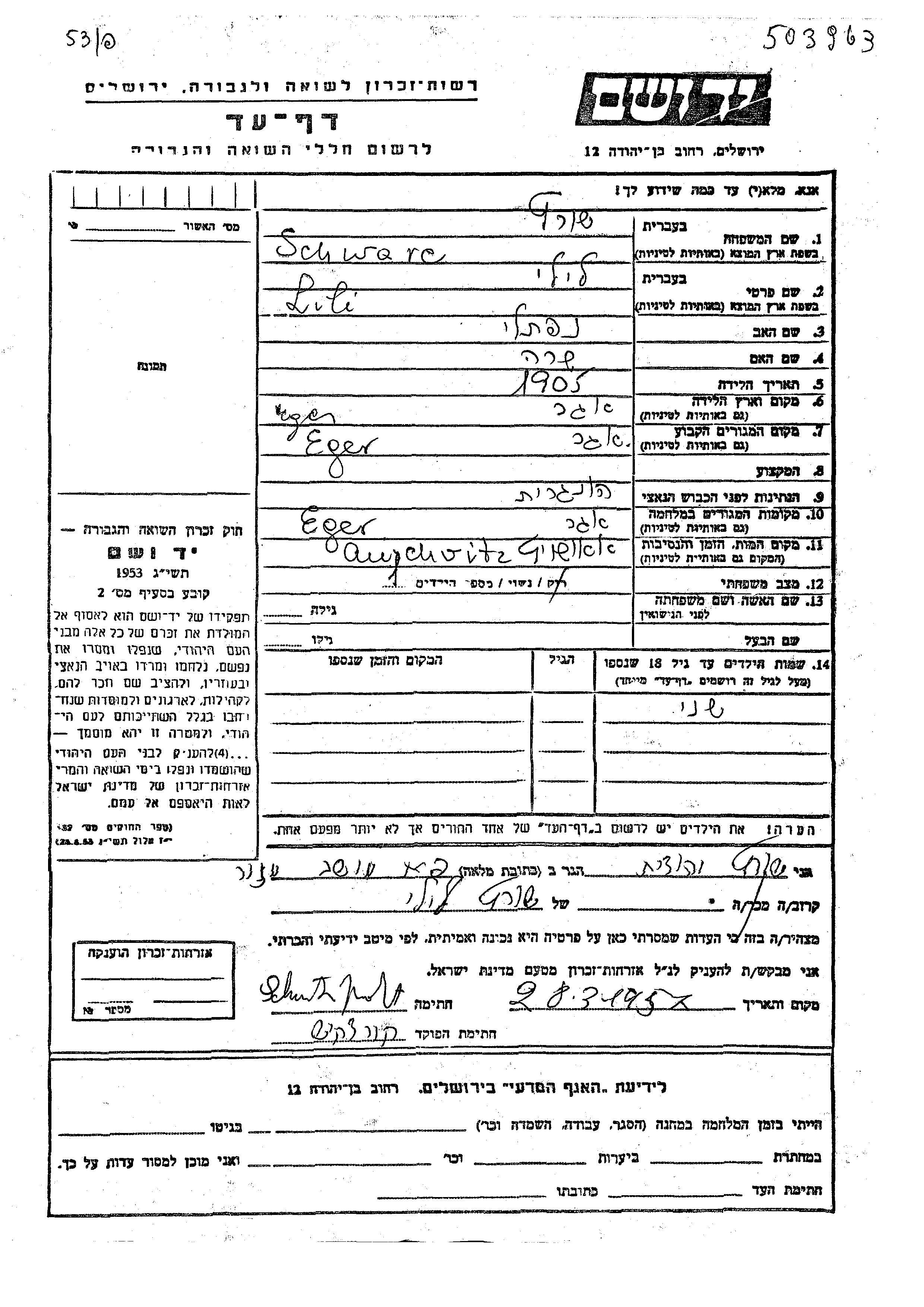 Лили Шварц, место рождения: Эгер. Отец: Нафтали, mать:Сара. Женат / замужем. Место жительства до войны: Эгер. Место во время войны: Эгер.